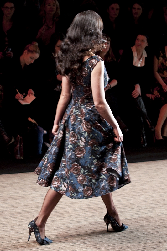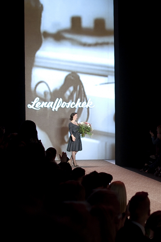 Ich spreche sie darauf an, wie relaxt sie backstage vor der Show gewirkt hat und sie meint: „Wenn Du Deine Kollektion kennst und magst und überzeugt bist, dass Du schöne Sachen zeigst, kann überhaupt nichts schiefgehen“, lächelt sie selbstbewusst. Zur immer wieder auftauchenden Frage nach dünnen Models ist Lenas Meinung: „Ich finde bei Models ganz ganz wichtig die Haltung, ich schaue weniger darauf ob zu dick oder zu dünn. Aber auch dünne Mädchen können sehr elegant und wunderschön aussehen und dieses ständige öffentliche Draufhacken ist schon ekelhaft. Toll ist, dass Franziska Knuppe für uns läuft. Sie ist nicht nur ein international bekanntes Model, sie ist ein nordischer, starker und sehr prägnanter Typ, eine richtige Superfrau“, ergänzt Lena noch.