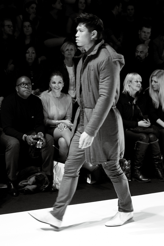 Der Schweizer Menswear Designer Marc Stone erfreute sein Publikum auf der Berliner Fashion Week mit interessanten Schnitten: Oberteile bis fast zu den Knien und Hosen, die zwischen engen Formen und lässigen Jodhpur-Styles variierten, taillierte Parkas, Lederjacken im Stil von Collegejacken in Kombination mit einfarbigen schwarzen und grauen Anzugshosen. Farblich eher zurückhaltend in grau, schwarz und blau verwendete er Materialien wie weiche Baumwolle, gewachste Stoffen und Wolle.