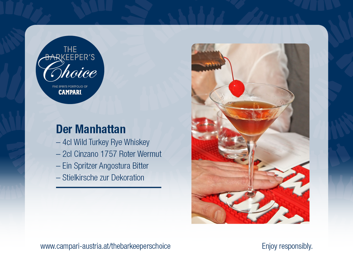 Der Manhattan ist ein klassischer Cocktail aus Whisky und rotem süßen Wermut und gehört als kleiner, aromatischer und stark alkoholischer Shortdrink zur Gruppe der Aperitifs oder Before-Dinner Cocktails.