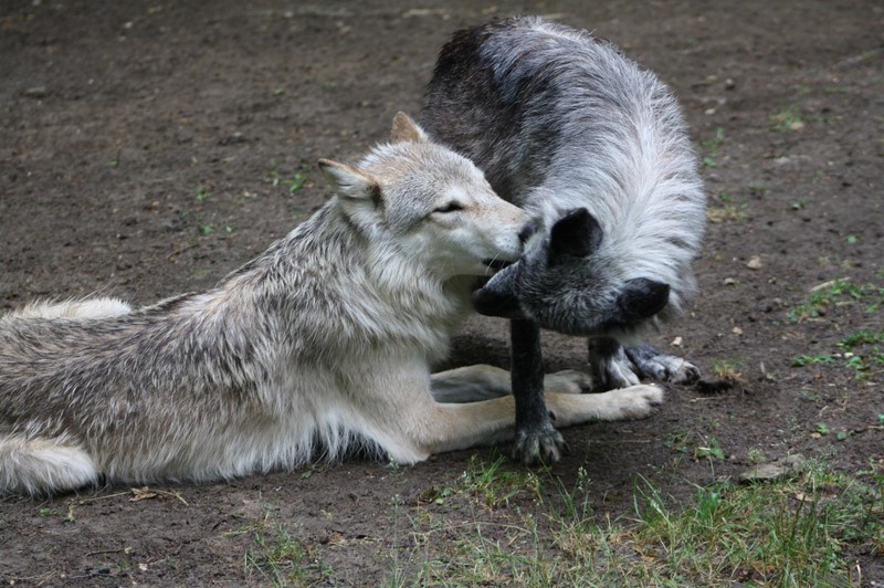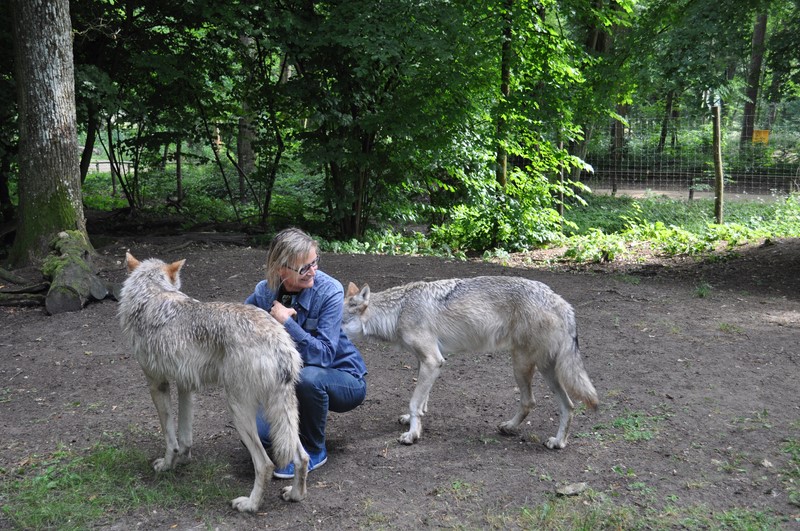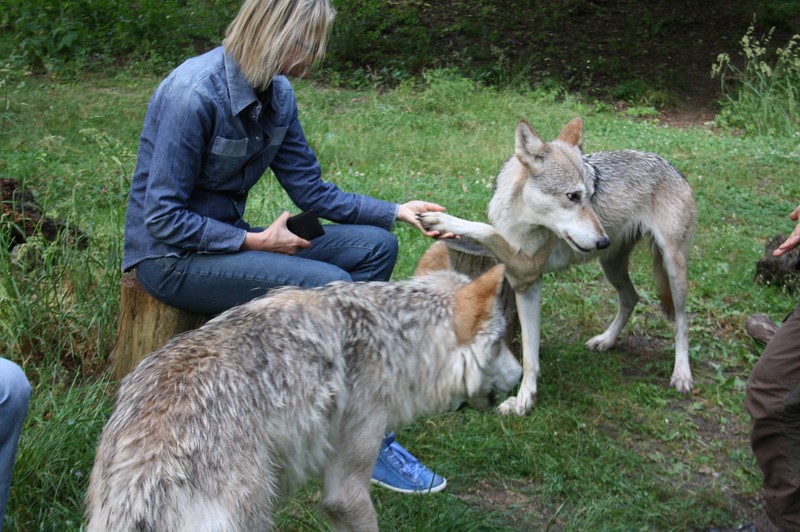 Wie mir Tiertrainerin Marleen Hentrup erklärte, wird grundsätzlich jeglicher Konflikt mit ihnen von klein auf vermieden. Wölfe und Hunde werden täglich trainiert: sie lernen Sitz, Platz, Pfote geben, sich überall anfassen zu lassen und an der Leine zu gehen. Sie bekommen dafür Leckerlis und sie haben die Gelegenheit, einmal etwas anderes als die „vier Wände“ ihrer eigenen Gehege zu sehen. So entwickeln sie eine generelle Kooperationsbereitschaft mit uns Menschen – und natürlich untereinander.