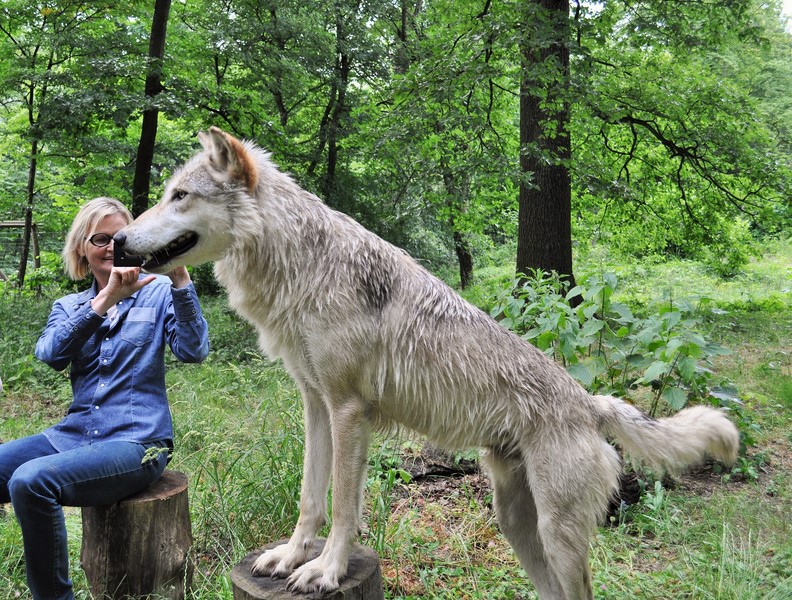 Ich war natürlich schon sehr neugierig, wie sich die Wölfe mir gegenüber verhalten werden, ob sie mich ‚akzeptieren‘ werden, und ich kann nur sagen: Es war ein wirklich unglaubliches Erlebnis, als mir ein Wolf seine Pfote gab, mich beschnüffelte und sich von mir streicheln ließ.