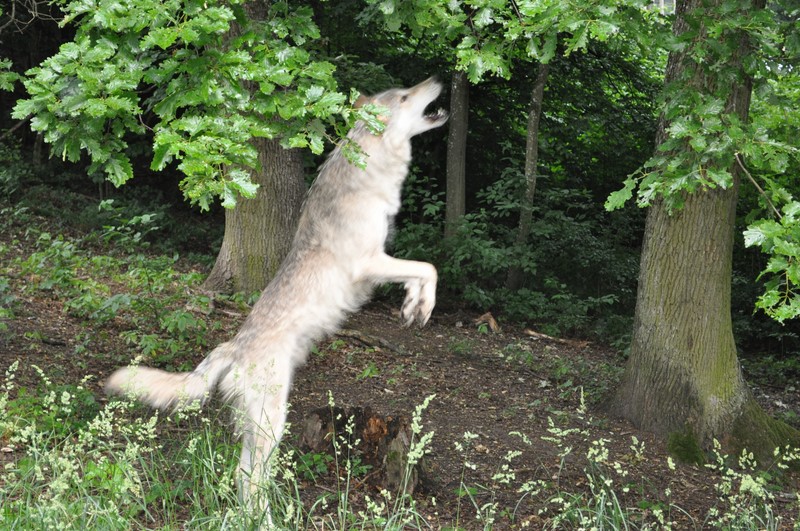 Alle drei Wölfe sind sehr lernfähig, aber Chitto ist wohl der, bei dem man sehr präzise sein muss, sonst macht er nur noch das Nötigste. Er ist wahnsinnig schnell im Durchschauen von Aufgaben und wie er mit wenig Aufwand zum Ziel kommt.