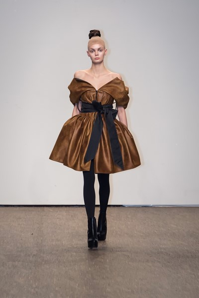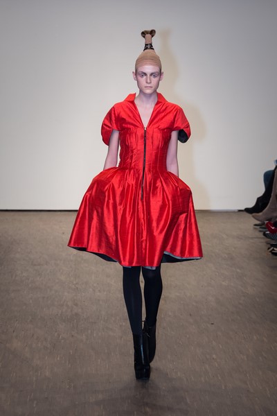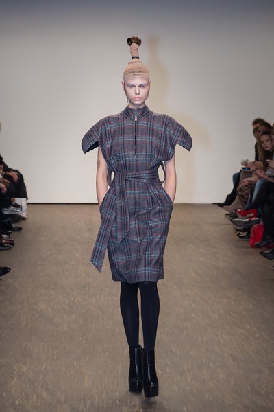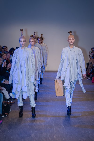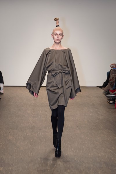 So präsentierte die Designerin elegante, knielange oder bodenlange Winterkleider, aber auch ein Corsagenkleid aus grob gewebten, bedruckten Reissäcken. Überhaupt überrascht Isabel Vollrath mit groben und strukturierten Stoffen, aus denen sie nicht nur Kleider, sondern auch Oberteile und Jumpsuits kreiert. Zu sehen waren russische und japanische Einflüsse.