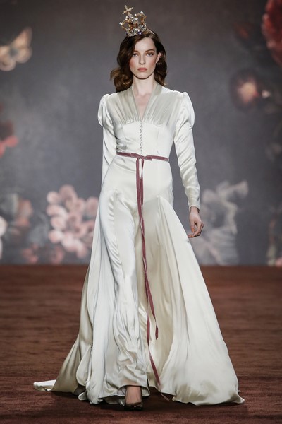 Neben zwei bodenlangen Couture Roben aus französischer Spitze und Seide fertigte das Atelier Lena Hoschek unter der Leitung von Thomas Kirchgrabner auch erneut ein atemberaubendes, von Wallis Simpson (Ehefrau von König Edward VIII., der für sie in den 30ern auf den Thron verzichtete) inspiriertes, hochgeschlossenes Brautkleid (Photo by Peter Michael Dills/Getty Images)