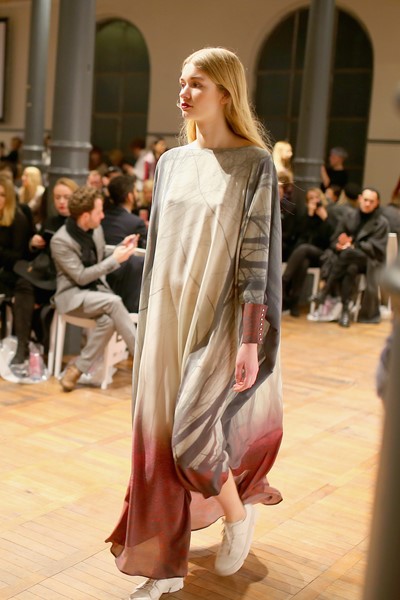 Leichte, fast schwerelose Chiffon Qualitäten werden von Marcel Ostertag mit fest gewebtem Kaschmir und hochwertigen Kunstpelzen zusammengeführt (Photo by Clemens Bilan/Getty Images)