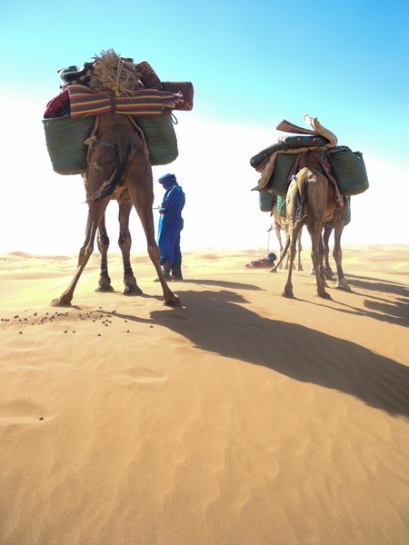 Wenn Nomaden einkaufen gehen, bedeutet das, das Dromedar zu satteln, meist 5 Tage ins nächste Dorf oder in die nächste Stadt zu gehen, einen Tag lang einzukaufen wie z.B. 50 Kilo Kartoffel, Karotten, Zucker, Mehl usw., und dann wieder zurück zu marschieren. Dann verschwinden sie wieder für 2 – 3 Monate in der Wüste (Foto Joe Haider)
