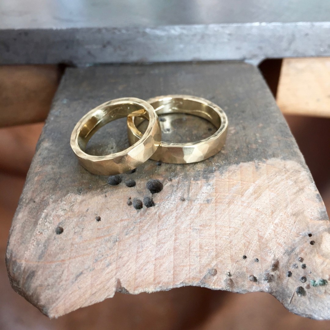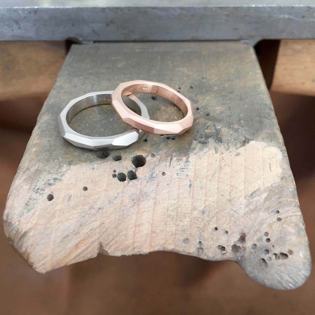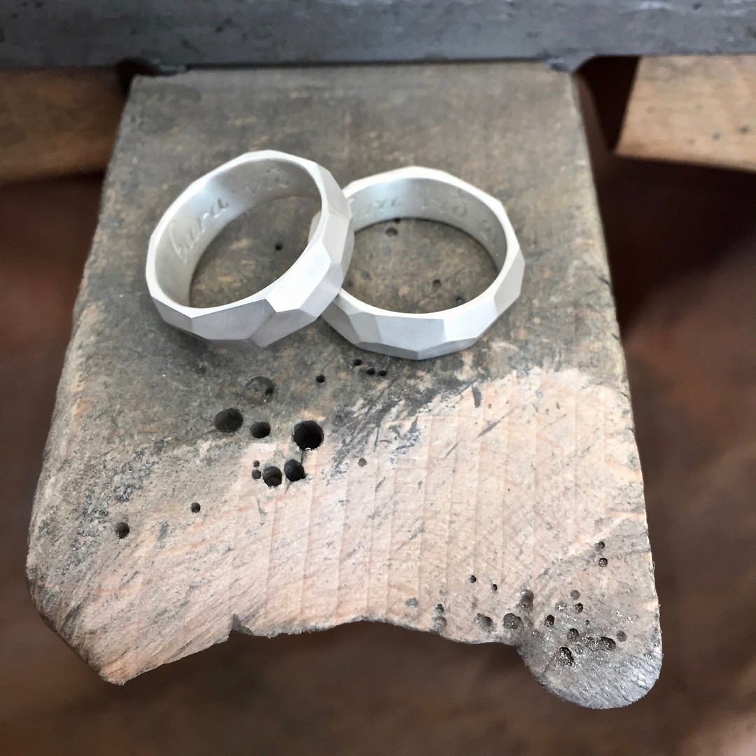 Schmuckdesignerin Katie Gruber kaschiert Unregelmäßigkeiten im Material nicht. Dies führt zu Ecken und Kanten, kleinen Einkerbungen und Unregelmäßigkeiten, die jeden Ring so individuell machen wie seinen Träger. Katie g. Eheringe sind demnach, je nach Charakter des Paares, manchmal eckig, manchmal rau, oder klassisch zart und fließend. Besondere Patinas führen dazu, dass sich das Stück bewusst verändert und mit der Zeit so individuell wird wie der Träger. Diese Individualität spielt eine zentrale Rolle in Katie’s Ehering Kreationen, die von Grund auf von Hand gemacht sind. Jedes Stück ist ein hochwertiges Unikat.
