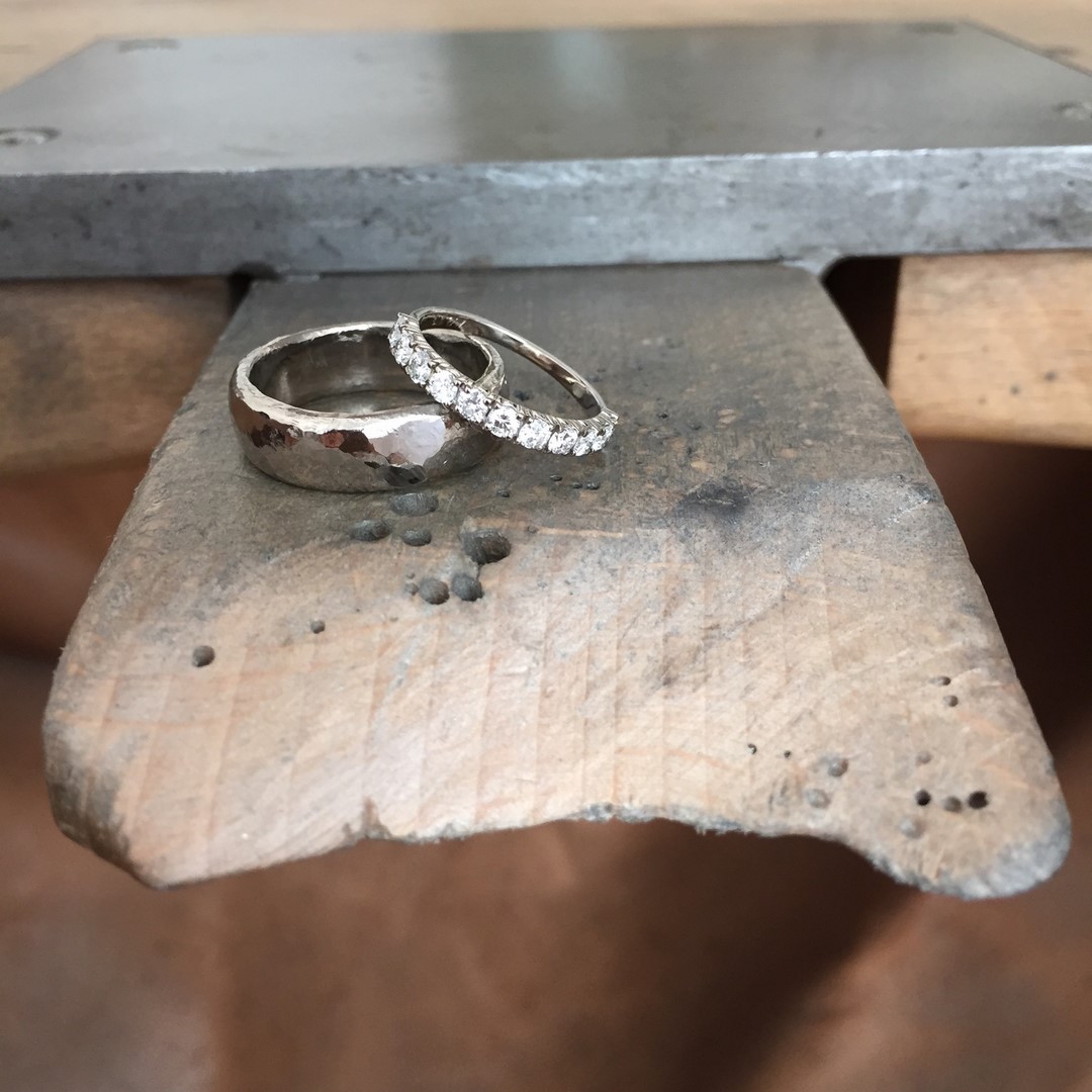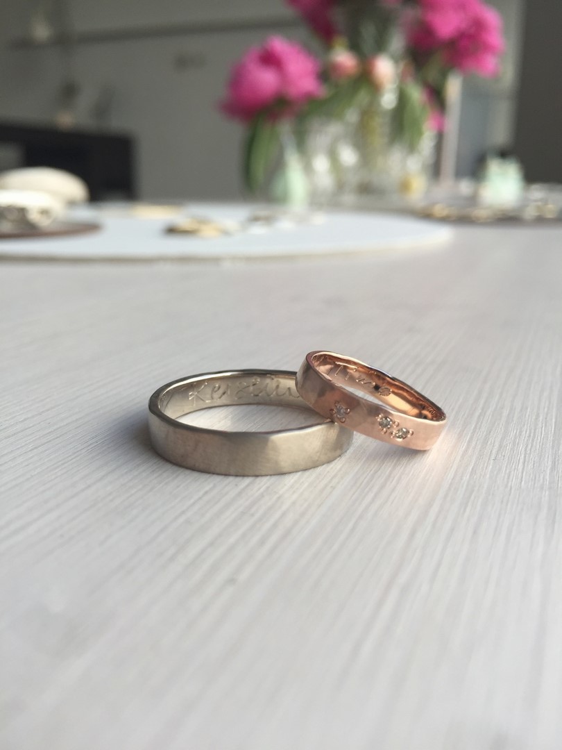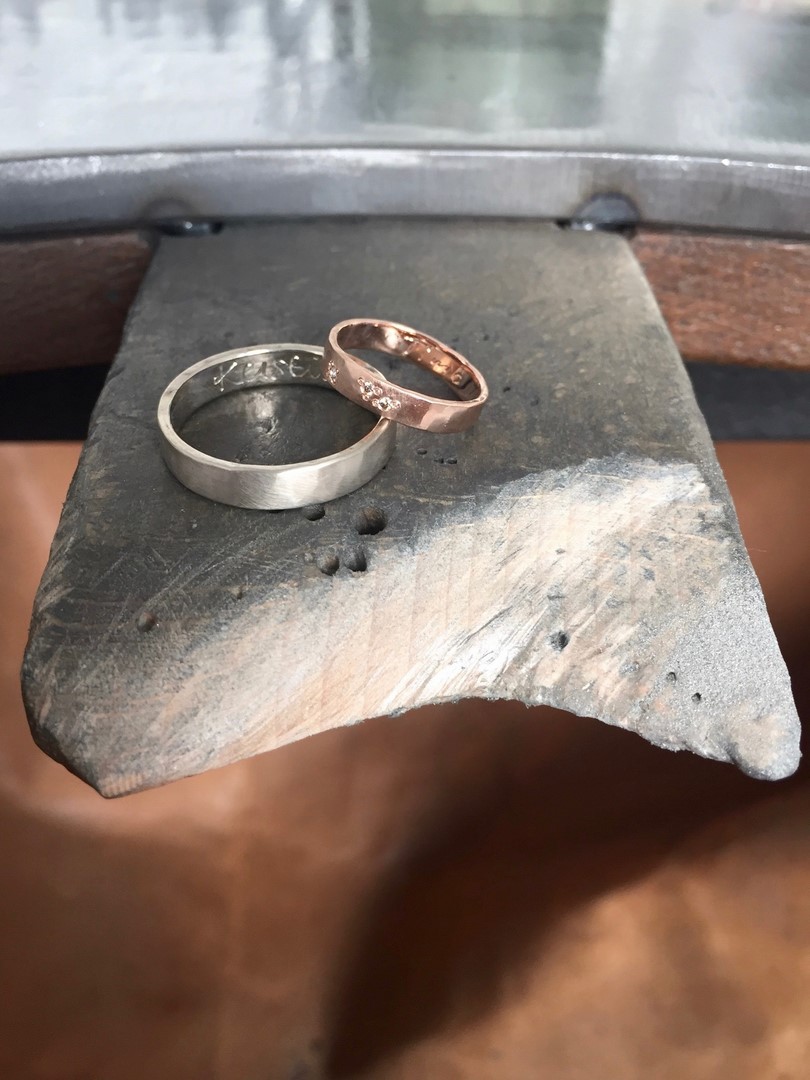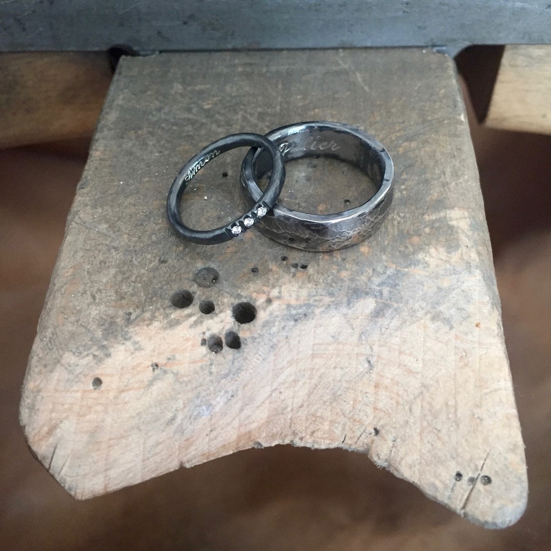 Schmuckdesignerin Katie Gruber kaschiert Unregelmäßigkeiten im Material nicht. Dies führt zu Ecken und Kanten, kleinen Einkerbungen und Unregelmäßigkeiten, die jeden Ring so individuell machen wie seinen Träger. Katie g. Eheringe sind demnach, je nach Charakter des Paares, manchmal eckig, manchmal rau, oder klassisch zart und fließend. Besondere Patinas führen dazu, dass sich das Stück bewusst verändert und mit der Zeit so individuell wird wie der Träger. Diese Individualität spielt eine zentrale Rolle in Katie’s Ehering Kreationen, die von Grund auf von Hand gemacht sind. Jedes Stück ist ein hochwertiges Unikat.