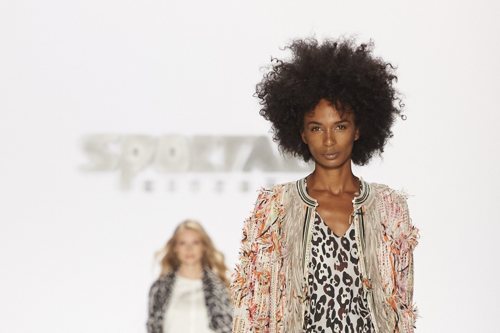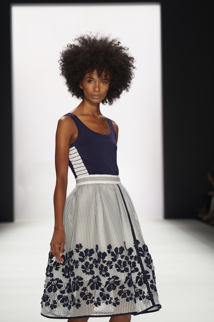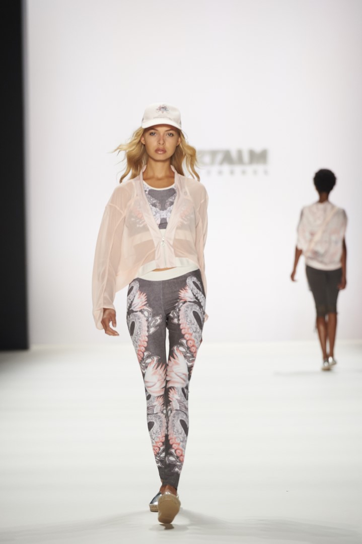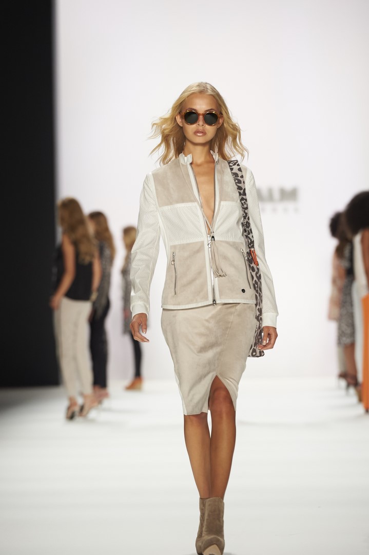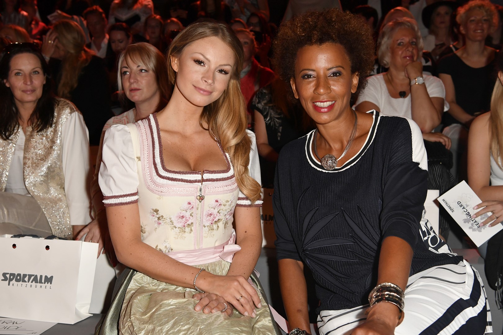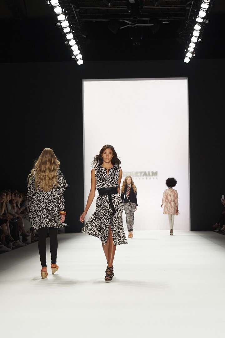 So startete SPORTALM seine Show mit acht Modeln in Dirndln aus hochwertigen Stoffen wie Seidenjaquard oder handbedruckten Baumwoll-Stoffen und allerfeinsten Stickereien. Danach zeigten insgesamt 26 Models, unter ihnen auch einige bekannte Gesichter, wie Kim Hnizdo, Elena Carrière und Fata Hasanovic, die luftig-feminine und sportlich elegante Seite von SPORTALM.