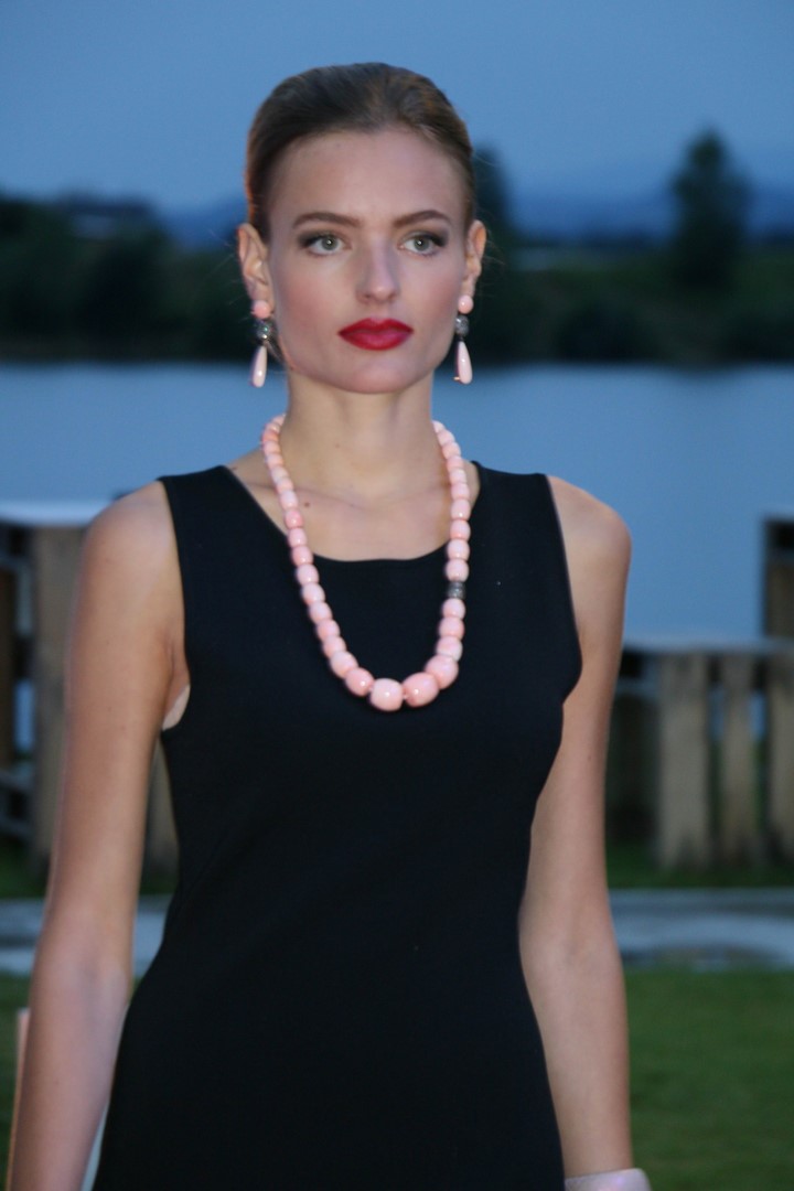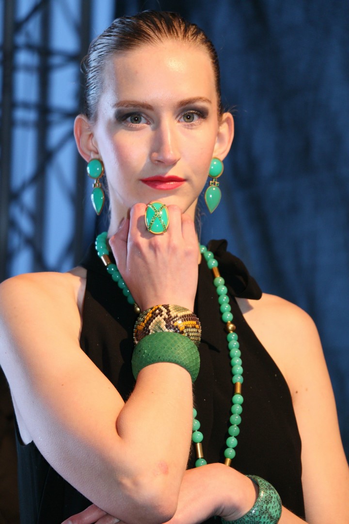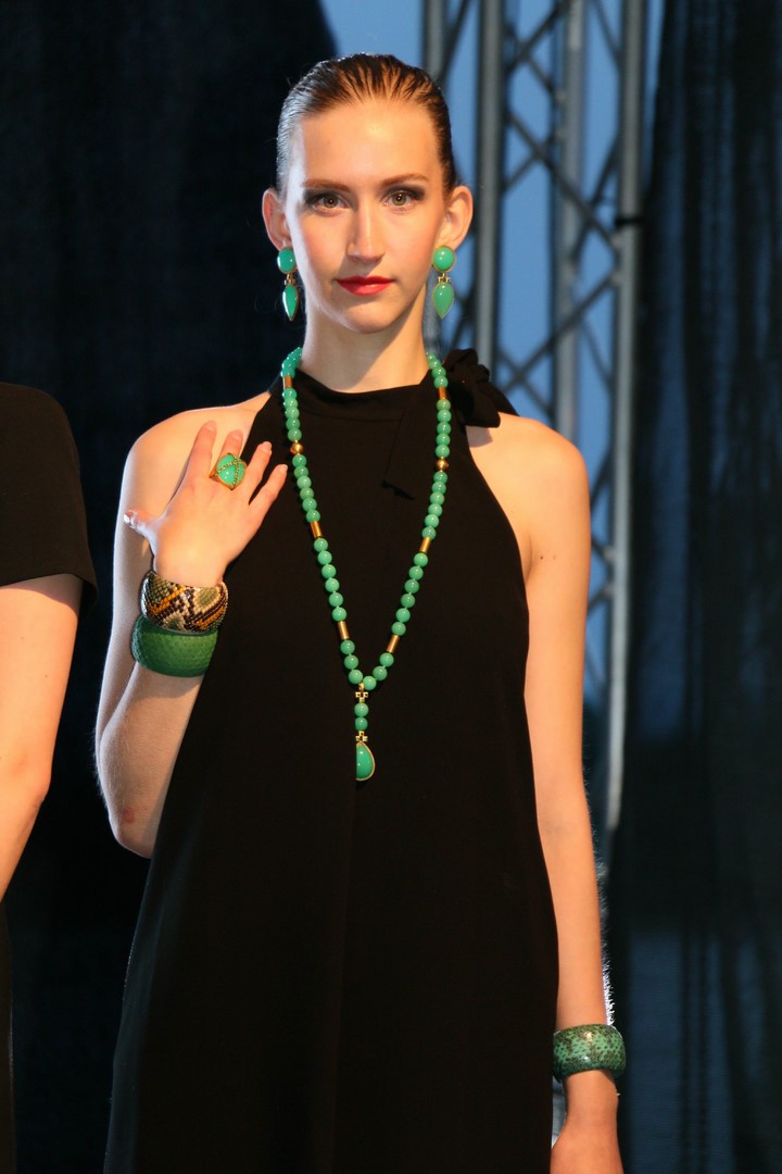 Topstücke der Modenschau: Amethyst Citrin (1222,75 ct ) Kragen Collier und Swiss Topas (917,79 ct) Bubikragen Collier mit Tsavoriten u. Brillanten besetzt, sowie ein Arizona Türkiscollier 3 reihig, Kette aus seltenen Südsee Barock Perlen.