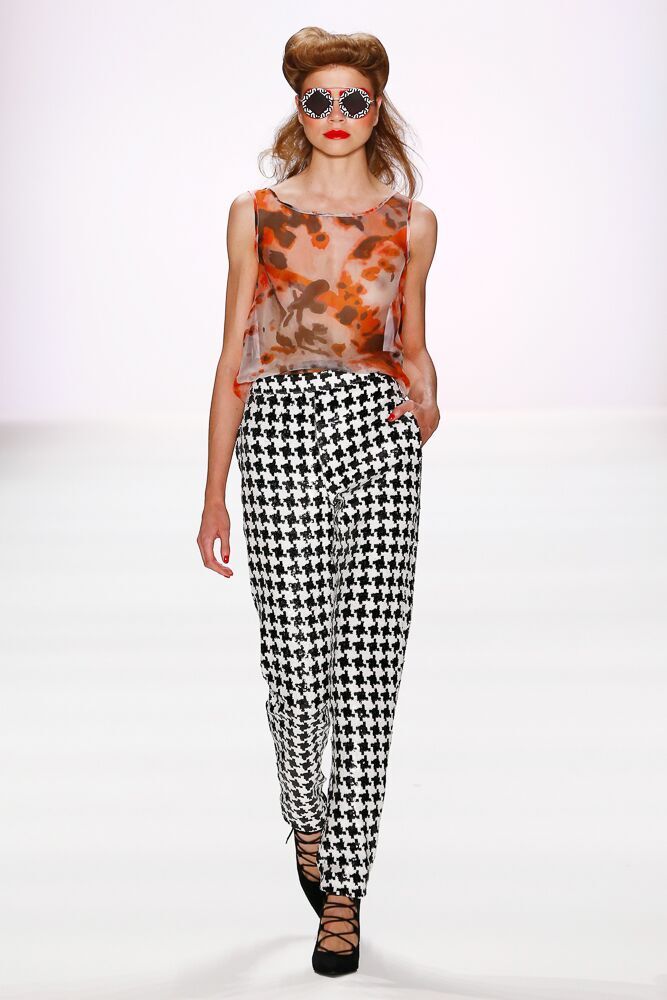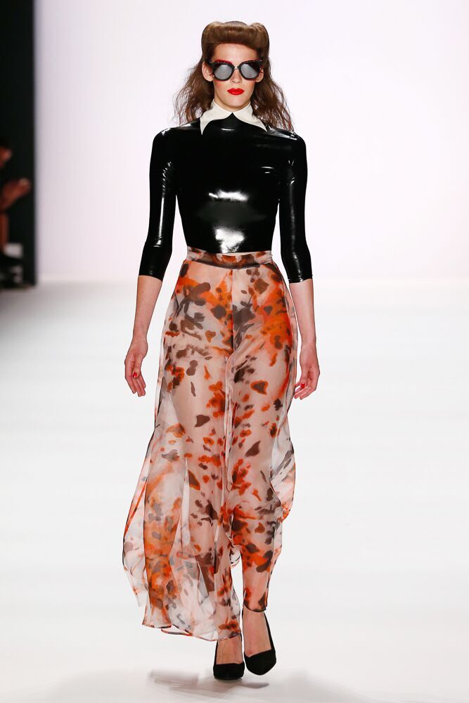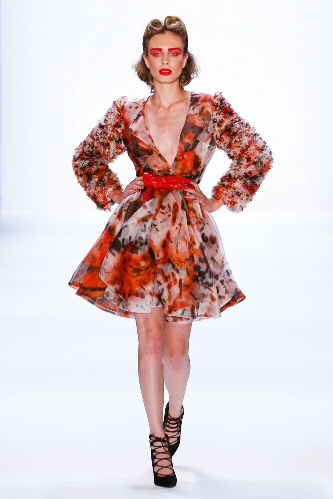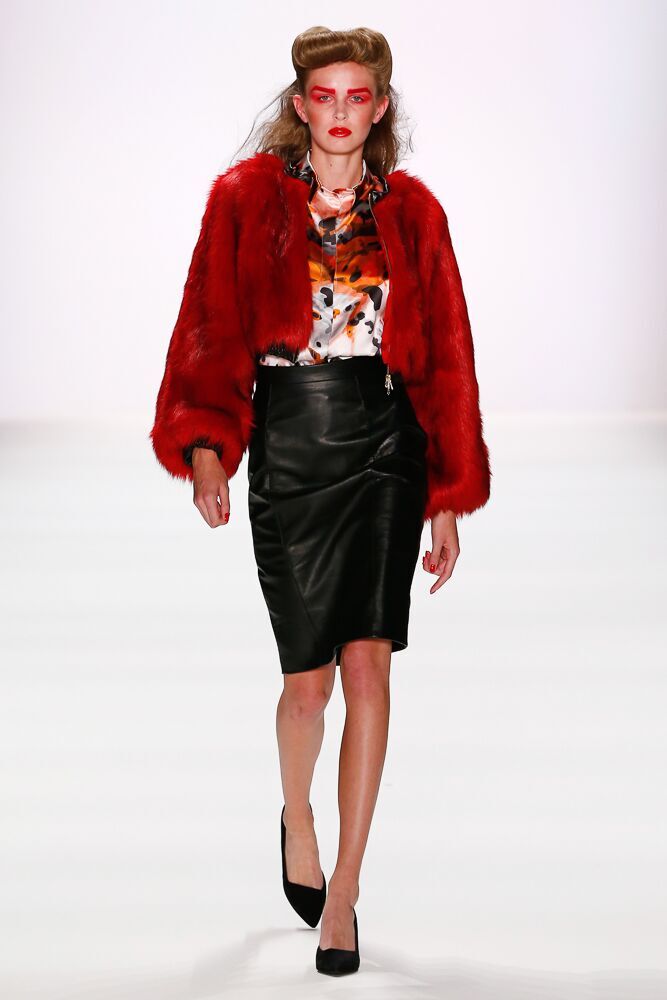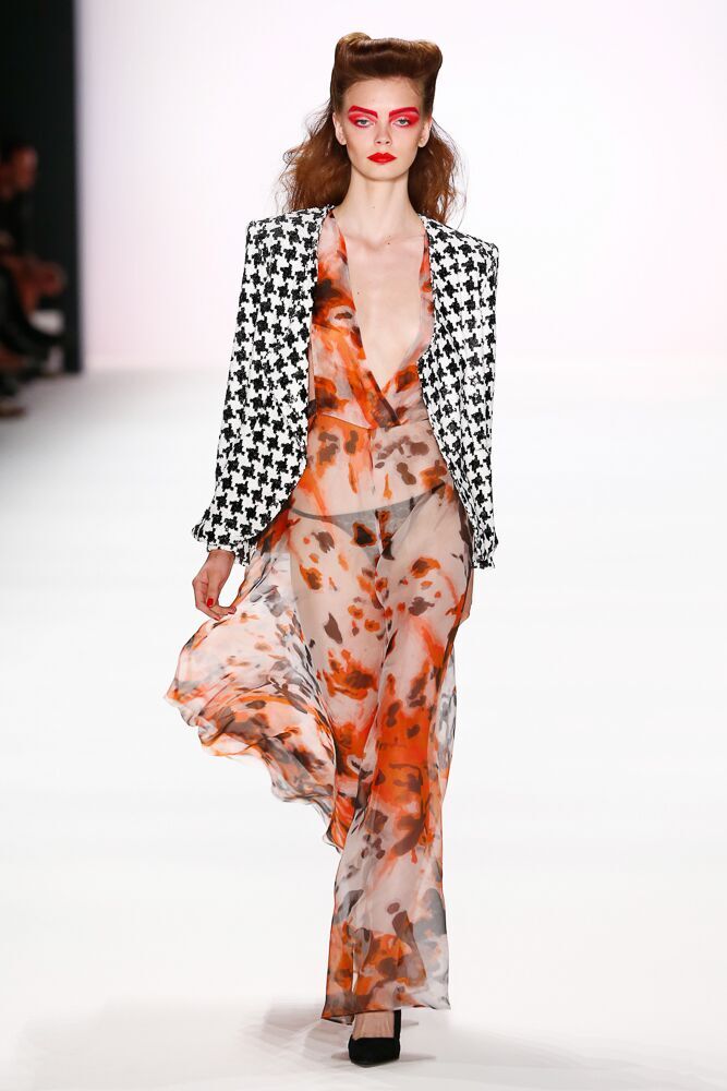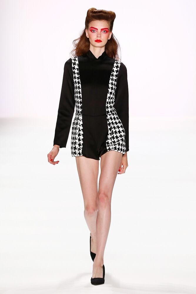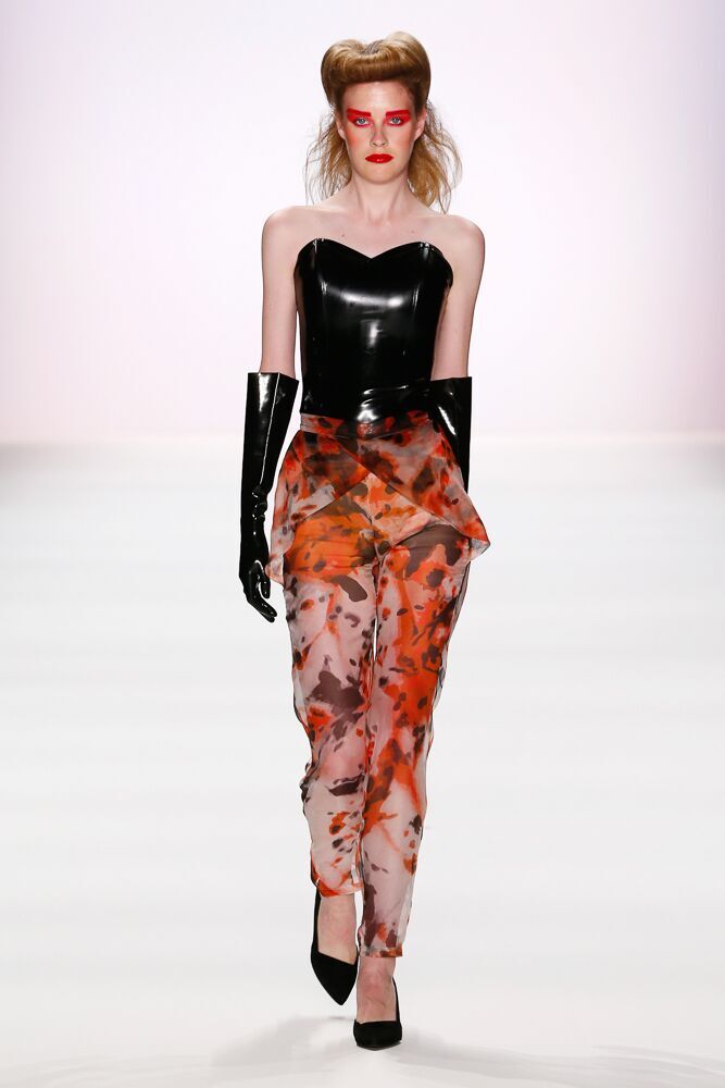 In seiner Spring/Summer 2017 Kollektion dominieren die Farben Schwarz, Weiß und Rot. Der Designer verwendet auch Pepita und macht damit aus einigen klassischen Teilen extravagante Stücke. Interessant auch die Vielfalt der verwendeten Materialien, die von Latex und Leder, über leichte Seide, bis hin zu Fell reichte. Thomas Hanisch arbeitete auch mit Pailletten.