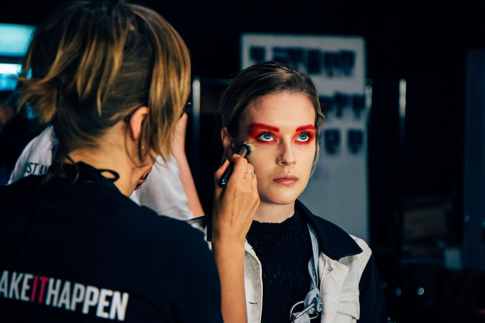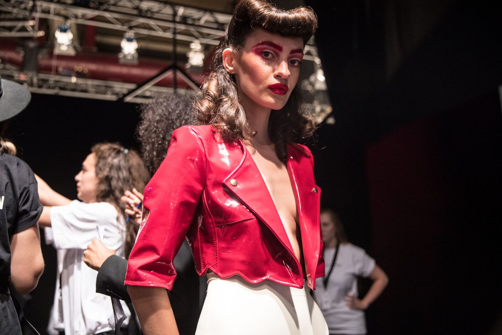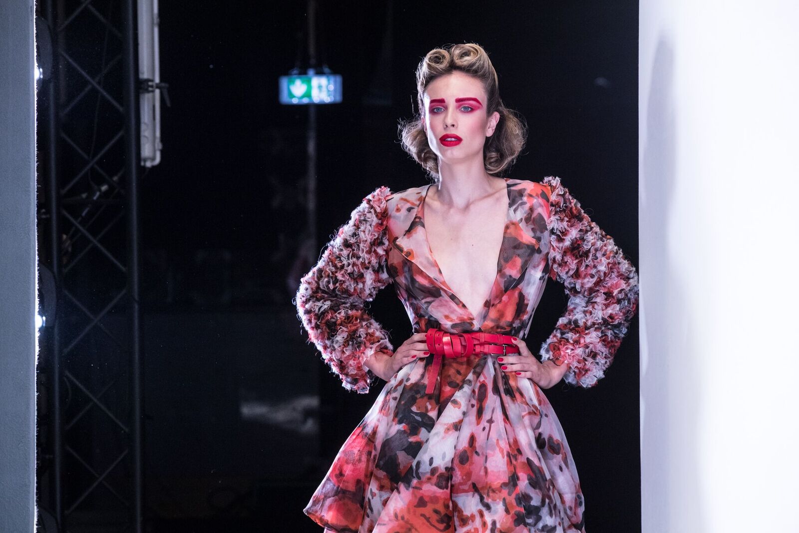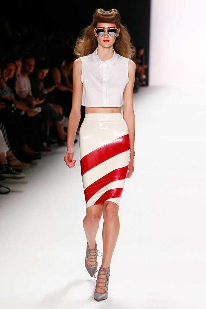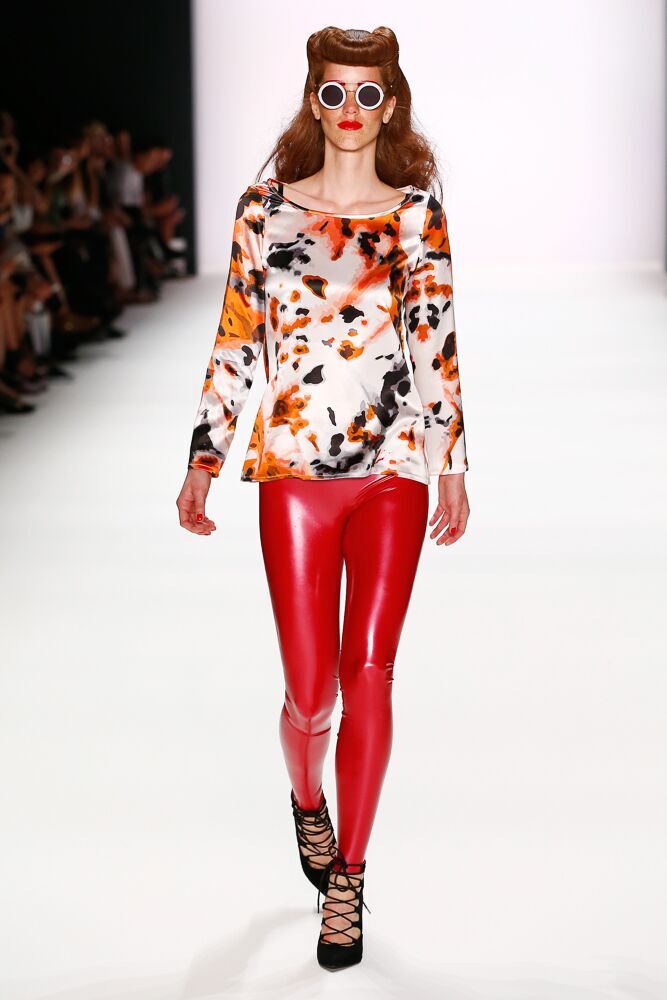 Die Models trugen toupierte Haare und knalliges Rot im gesamten Augenbereich – cool die ausgefallenen Sonnenbrillen.