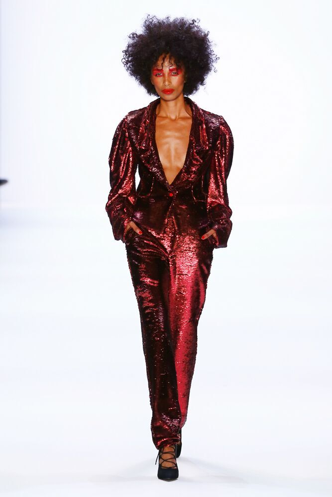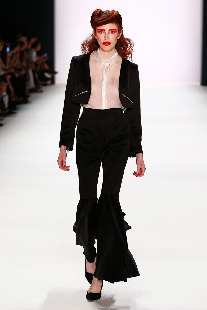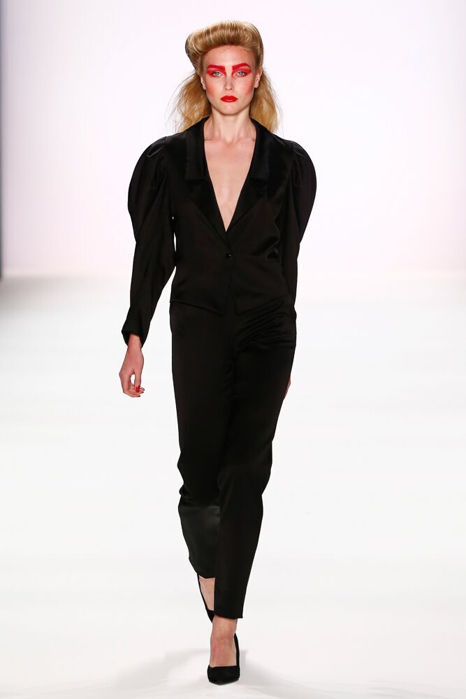 Der erste Look auf seiner Show: ein schwarzer Hosenanzug aus Satin mit Volants als Bootcut, kombiniert mit einer weißen, transparenten Bluse – ein Look für starke Frauen.