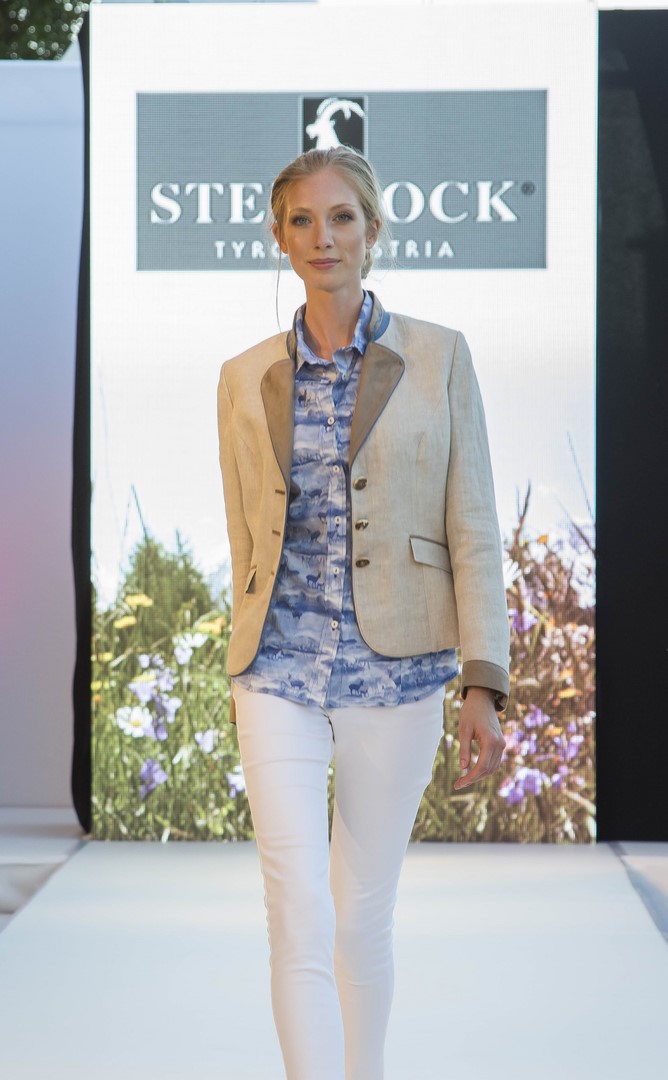 Steinbock greift traditionelle Elemente der Tracht wieder verstärkt auf. Romantische Rüschen an Blusen, Miedern und Röcke schmücken die sehr feminin designte Kollektion. Dem Thema Kleid widmet Steinbock eine besonders große Aufmerksamkeit. Exklusive Drucke, die sich vom T-Shirt bis hin zum Jerseykleid durch das Programm ziehen, sind floral inspiriert. Ansonsten verwendet Steinbock leichtes, knitterarmes Leinen und Baumwollqualitäten.