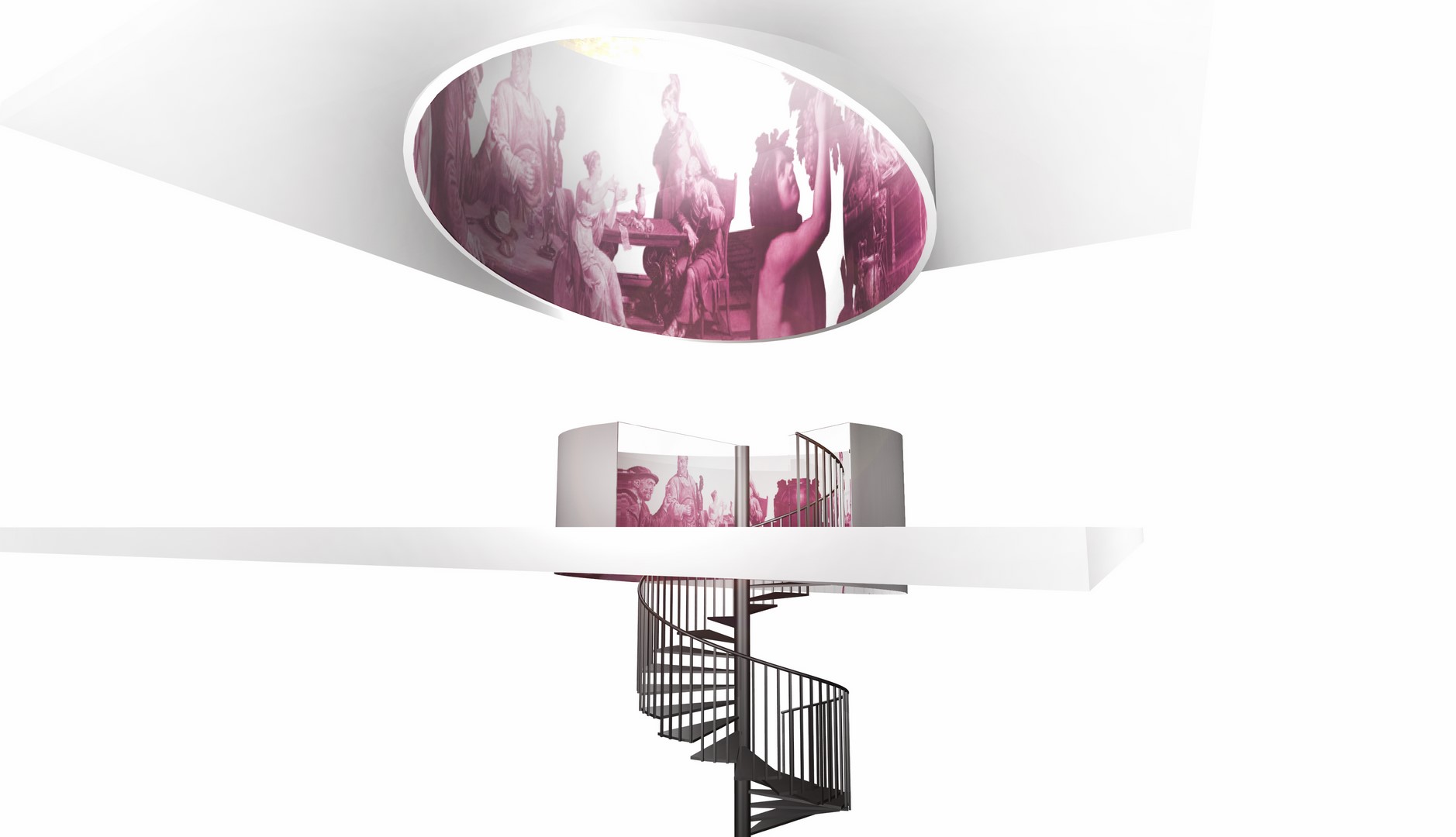 Der Raum hält sich in dezentem Betongrau im Hintergrund. Kontraste bilden rote Samtstoffe, gelbgoldene Spiegelflächen und die warmen Holznuancen der Tischplatten. Ausschnitte aus berühmten Gemälden, die Thematiken rund um die antike Götterwelt aufgreifen, werden gemäß dem WEIN & CO Stil neu interpretiert und zieren bald als Fresken die Wände des Flagshipstores.