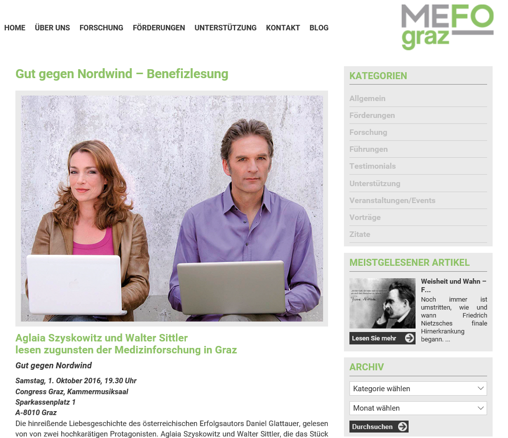 Aglaia Szyskowitz und Walter Sittler lesen zugunsten der Medizinforschung in Graz ‚Gut gegen Nordwind‘. Am 1. Oktober 2016, 19.30 Uhr, lädt die MEFOgraz zu einem besonderen Leseabend in den Kammermusiksaal im Congress Graz. Der Reinerlös dieser Charity-Veranstaltung kommt Forschungsprojekten der Med Uni Graz zugute.