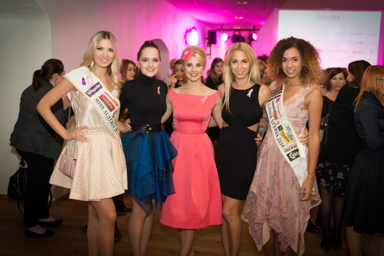 Die amtierende Miss Austria Dragana Stankovic, Designerin Eva Poleschinski, Moderatorin Silvia Schneider, Charity-Initiatorin & Tänzerin Yvonne Rueff und Vize Miss Steiermark Allegra Bell (Foto Felix Werinos)