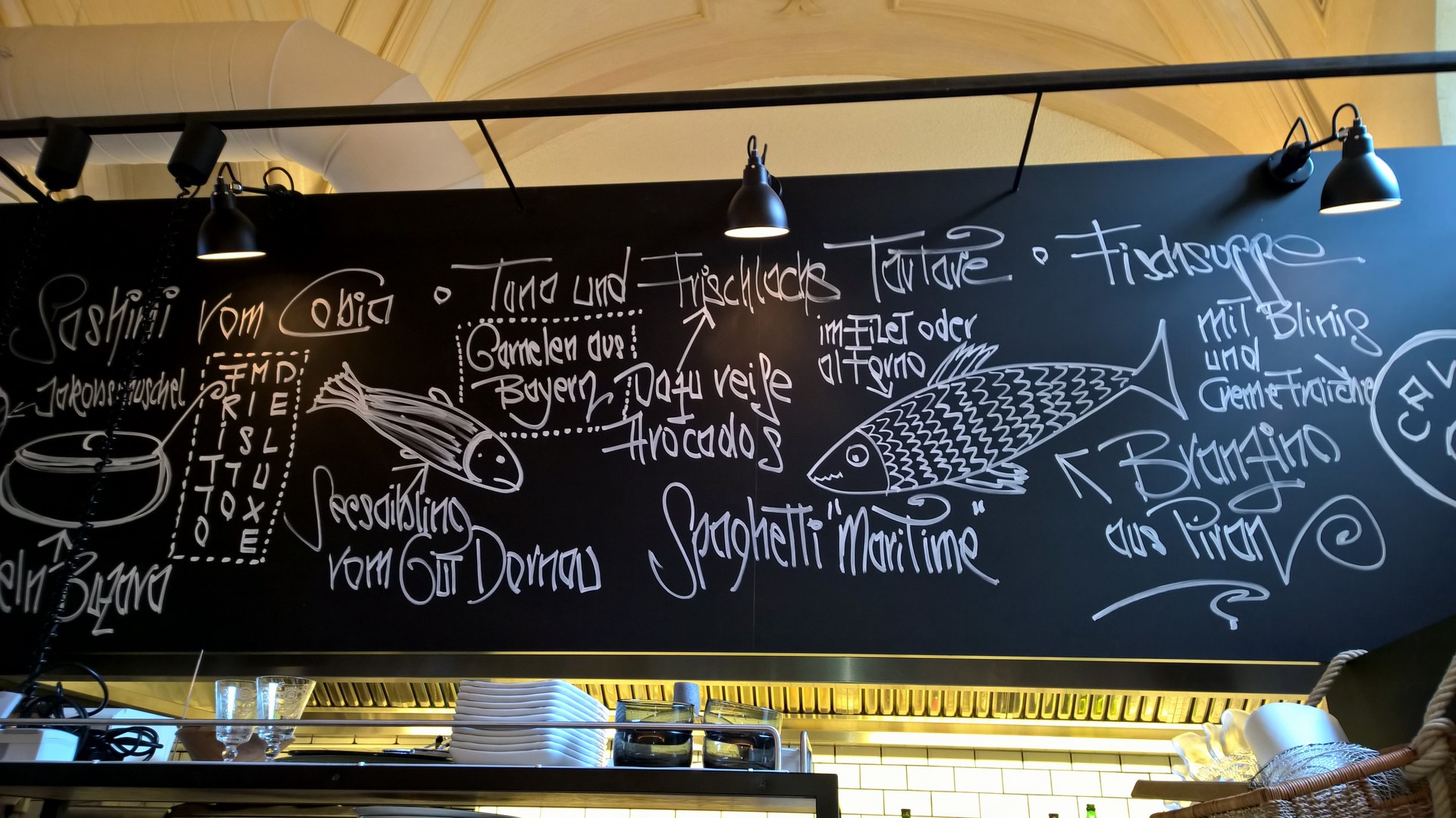 Das EL PESCADOR im Rathaus hat Montag bis Samstag von 11.30 bis 22 Uhr geöffnet. Mittags gibt es einen „Catch of the day“, einige Specials, Vorspeisen aus der Vitrine zum Selbstzusammenstellen, eine Tarte und natürlich die herrliche Fischsuppe (Foto Reinhard Sudy)