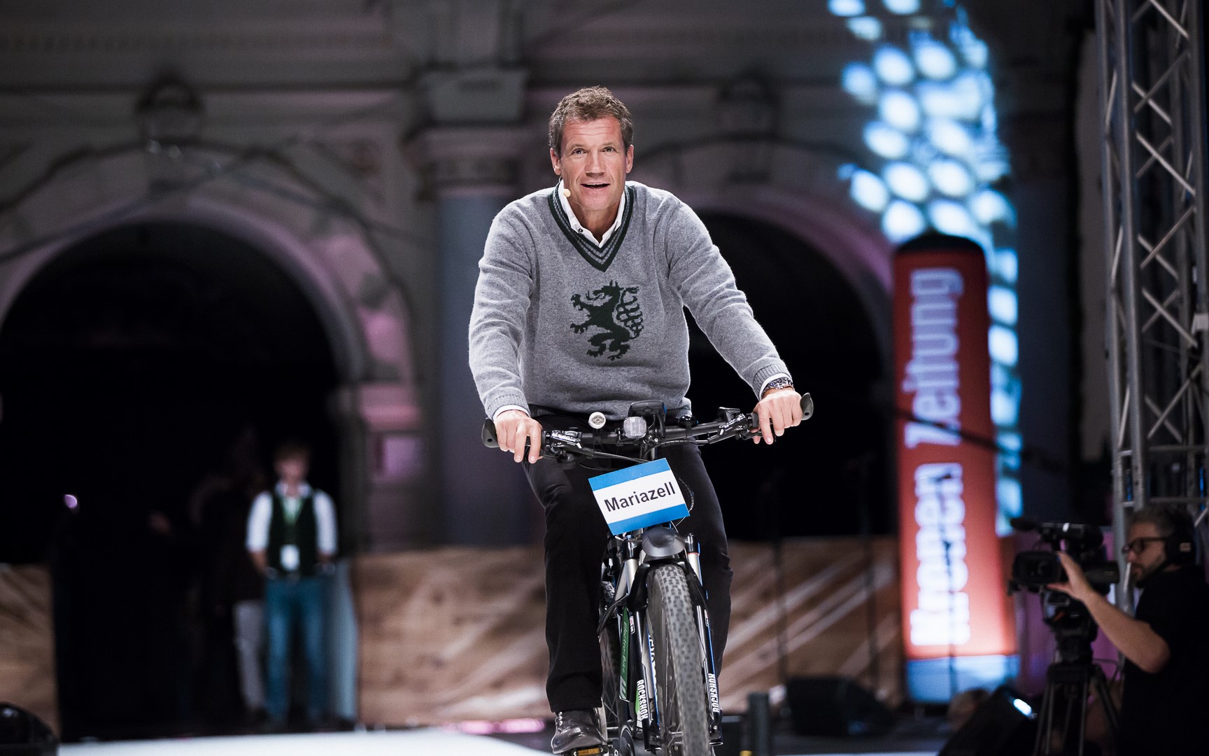 Moderator Armin Assinger kam mit dem Rad zur „Pracht der Tracht“ und drehte damit eine Runde am Laufsteg (Foto Ivents/Marija Kanizaj)