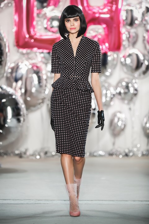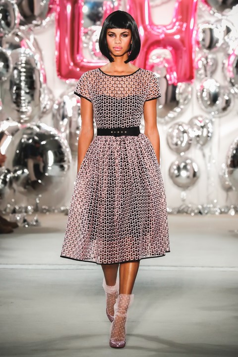 Lena ließ ihre Models zu Songs von Kim Wilde, The Donnas und Cindy Lauper (“Girls Just Wanna Have Fun”) mit kinnlangen, schwarzen Perücken wie bei der freizügigen Pariser Kabaretttanztruppe Crazy Horse und glitzernden, mit winzigen Sternchen beklebten Lippen über den Laufsteg laufen.