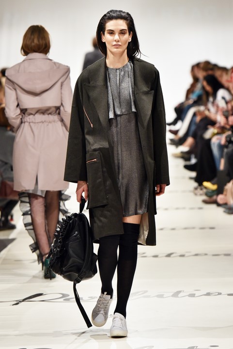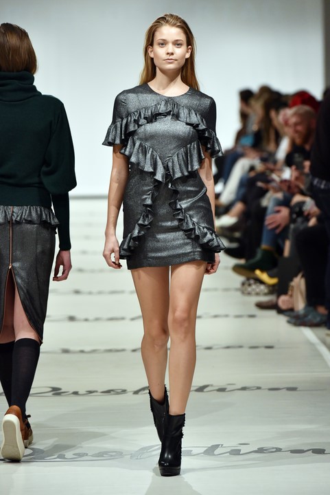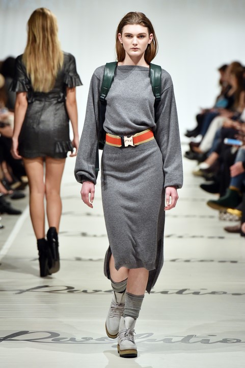 Marcel Ostertag schickt seine Models mit grauen Knee-high-Stiefel, grauen Volant-Boots, braunen Stiefeletten und hellen Sneakern auf den Laufsteg. Für Tamaris hat er eine Premium-Schuhkollektion entworfen, die in 28 Länder geliefert wird (Photo by Zacharie Scheurer/Getty Images for IMG)
