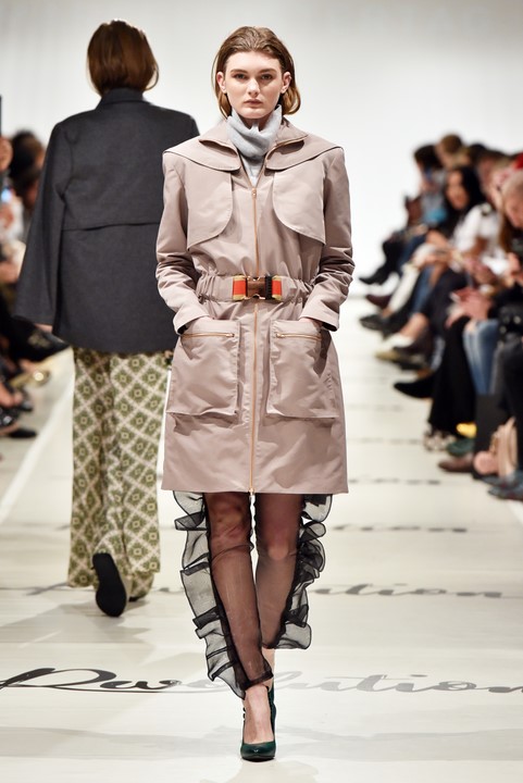 Einen spannenden Bruch zum Loden bilden bei Marcel Ostertag zarte Seidenstoffe mit weich wiegenden Volant-Verzierungen (Photo by Zacharie Scheurer/Getty Images for IMG)