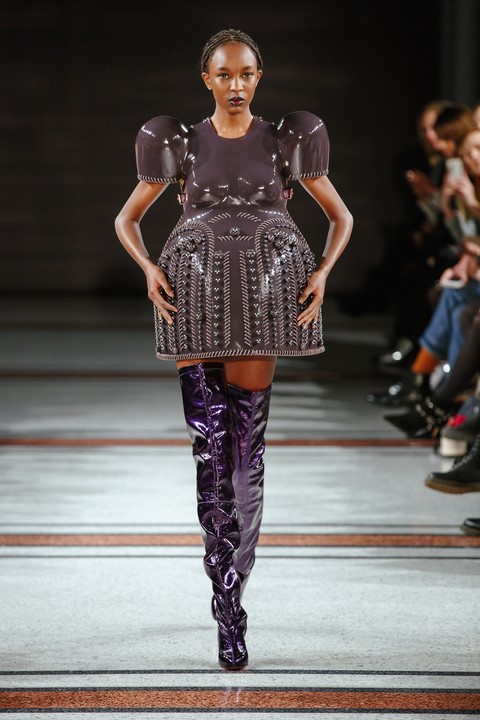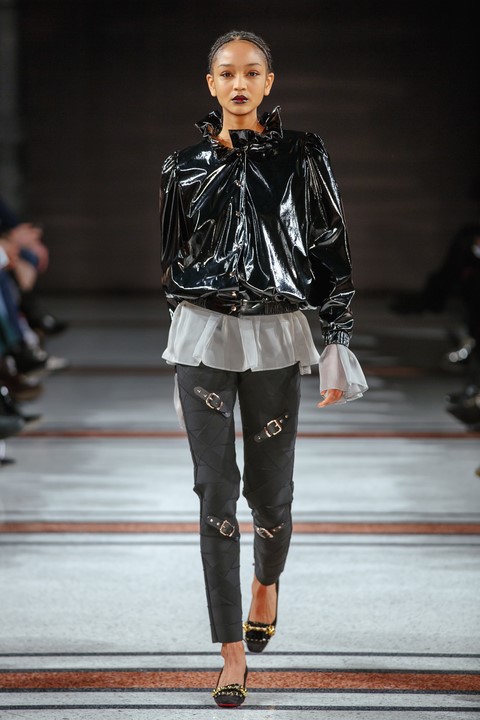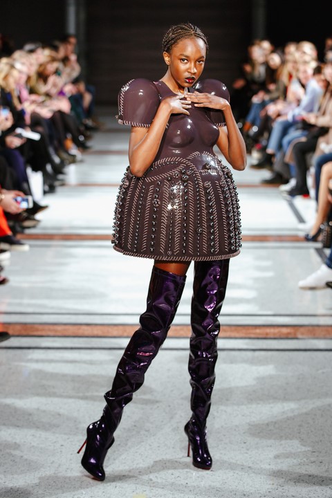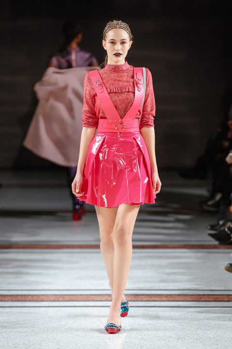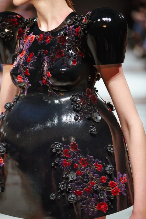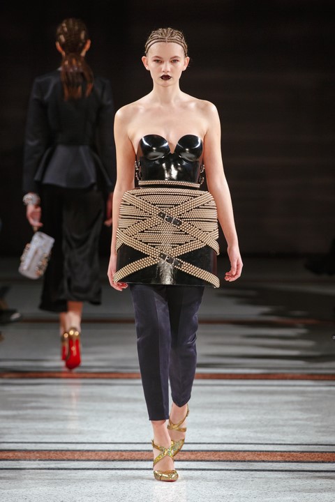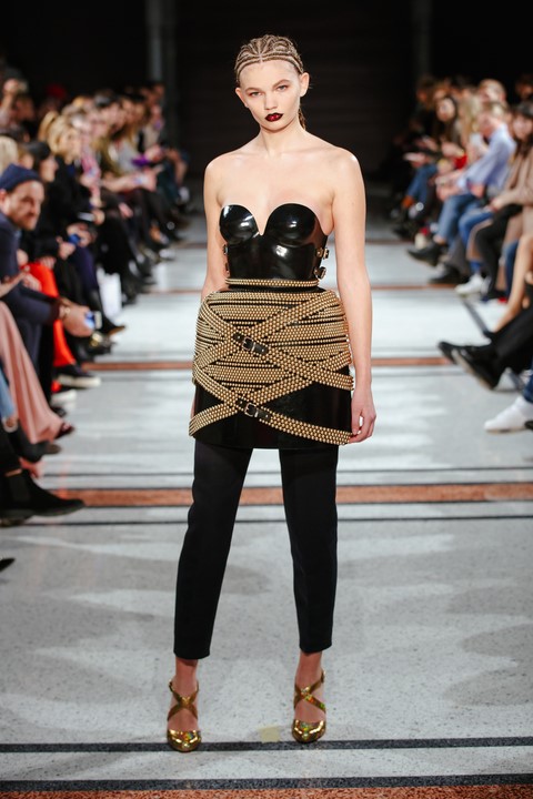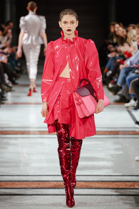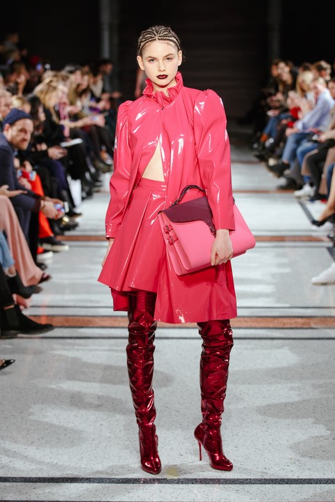 Wie immer bei Marina Hoermanseder: Lack, Korsagen, Schnallen und Lederriemen. Neu die Farbe Schwarz, aber auch viel Pink (Foto Stefan Kraul)