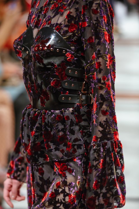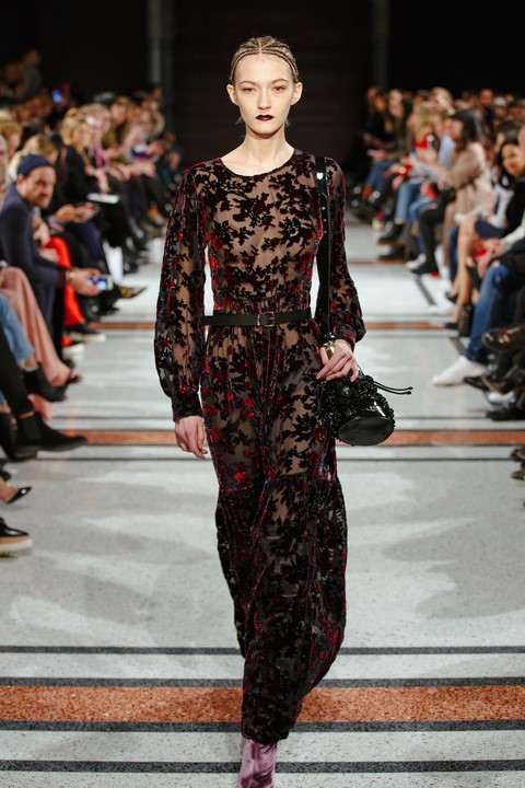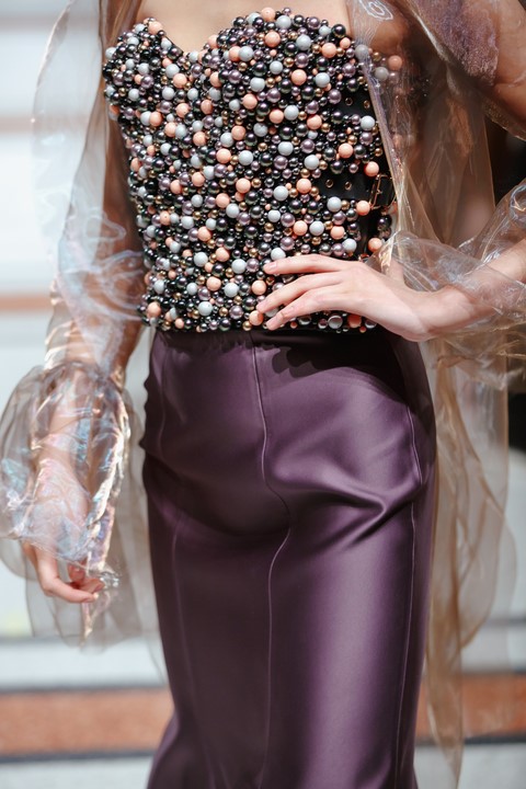 Neben superweite Hosen und zarten, durchsichtigen Oberteilen und kräftig aufgeputzte Korsagen sah man auch Ausbrennersamt für schlichte Kleider und Satin mit samtigen Finish bei Marina Hoermanseder (Foto Stefan Kraul)