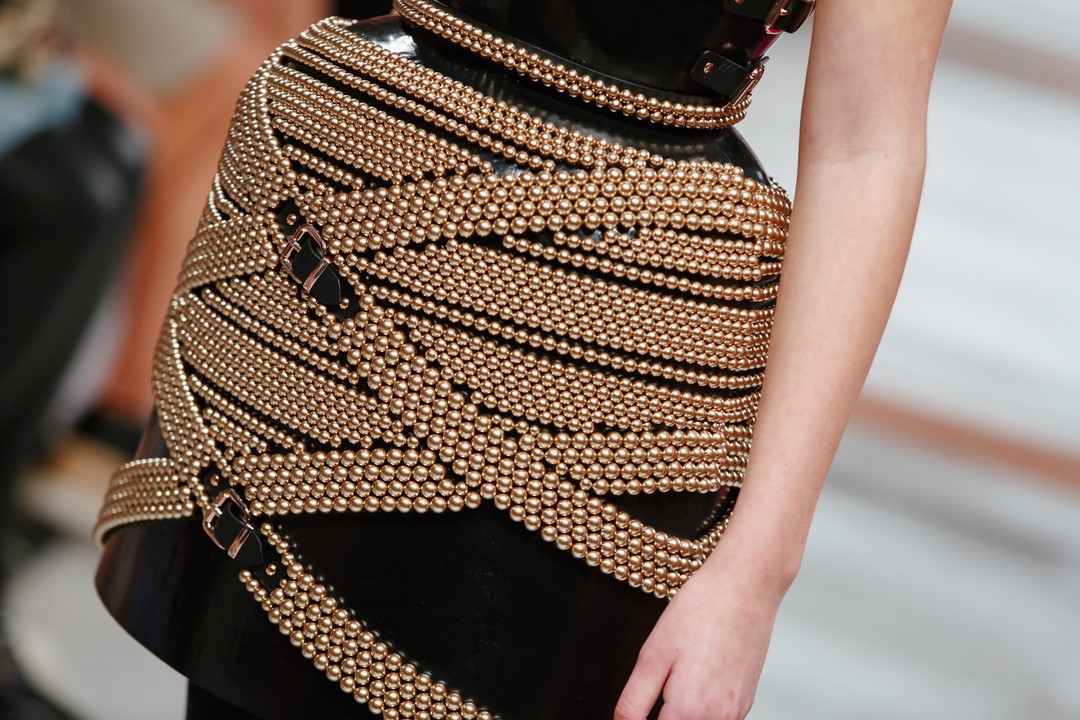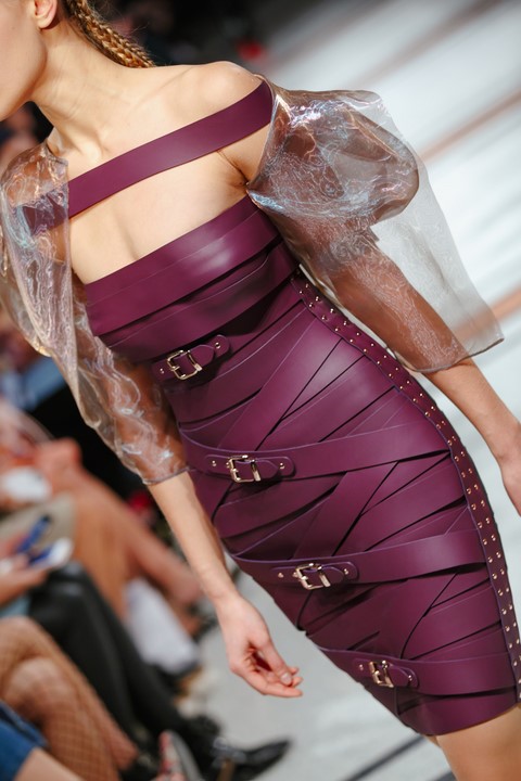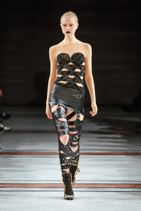 Marina Hoermanseder: Ihr Markenzeichen blieben auch diesmal ihre kreuz und quer laufenden Gürtel, die sie auch als Muster übersetzt in Wirkwaren wie Strümpfe und Catsuits zeigte (Foto Stefan Kraul)