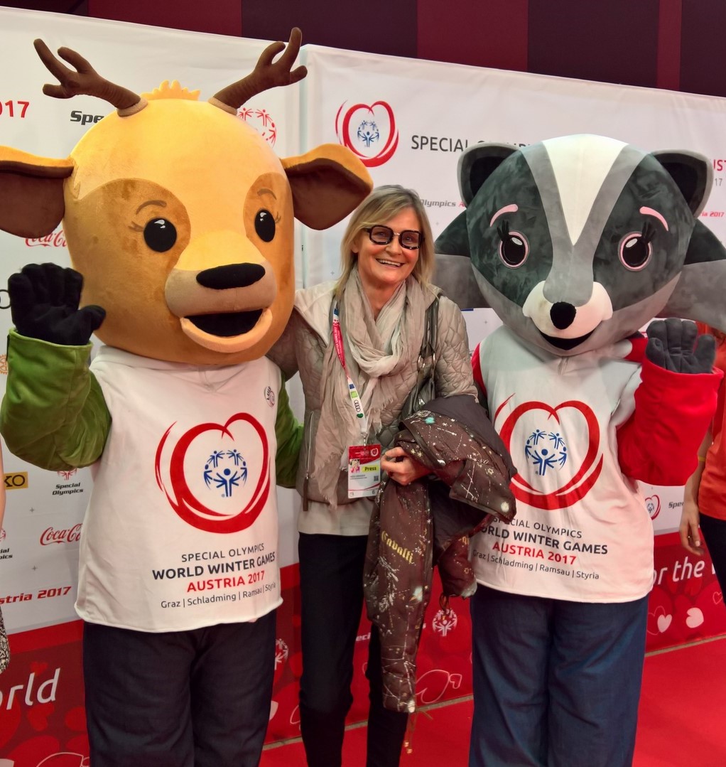 Journalistin und Bloggerin Hedi Grager mit den Special Olympics Maskottchen.
