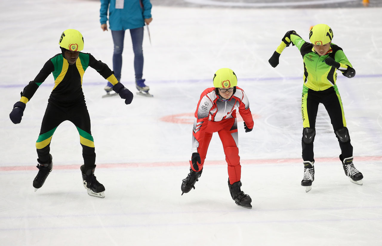 GRAZ,AUSTRIA,19.MAR.17 – SPECIAL OLYMPICS, SPEED SKATING – World Winter Games, 222m. Image shows Dave Oddman (JAM), Lukas Trojer (AUT/ Europe) and Chit Wai Lam (MAC). Photo: GEPA pictures/ Christian Walgram