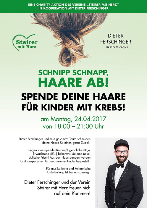„Schnipp Schnapp Haare ab – Spende deine Haare“ ist eine Charity-Aktion am 24. April von 18 Uhr bis 21 Uhr im Hairsalon von Dieter Ferschinger in der Grazer Neutorgasse 55.