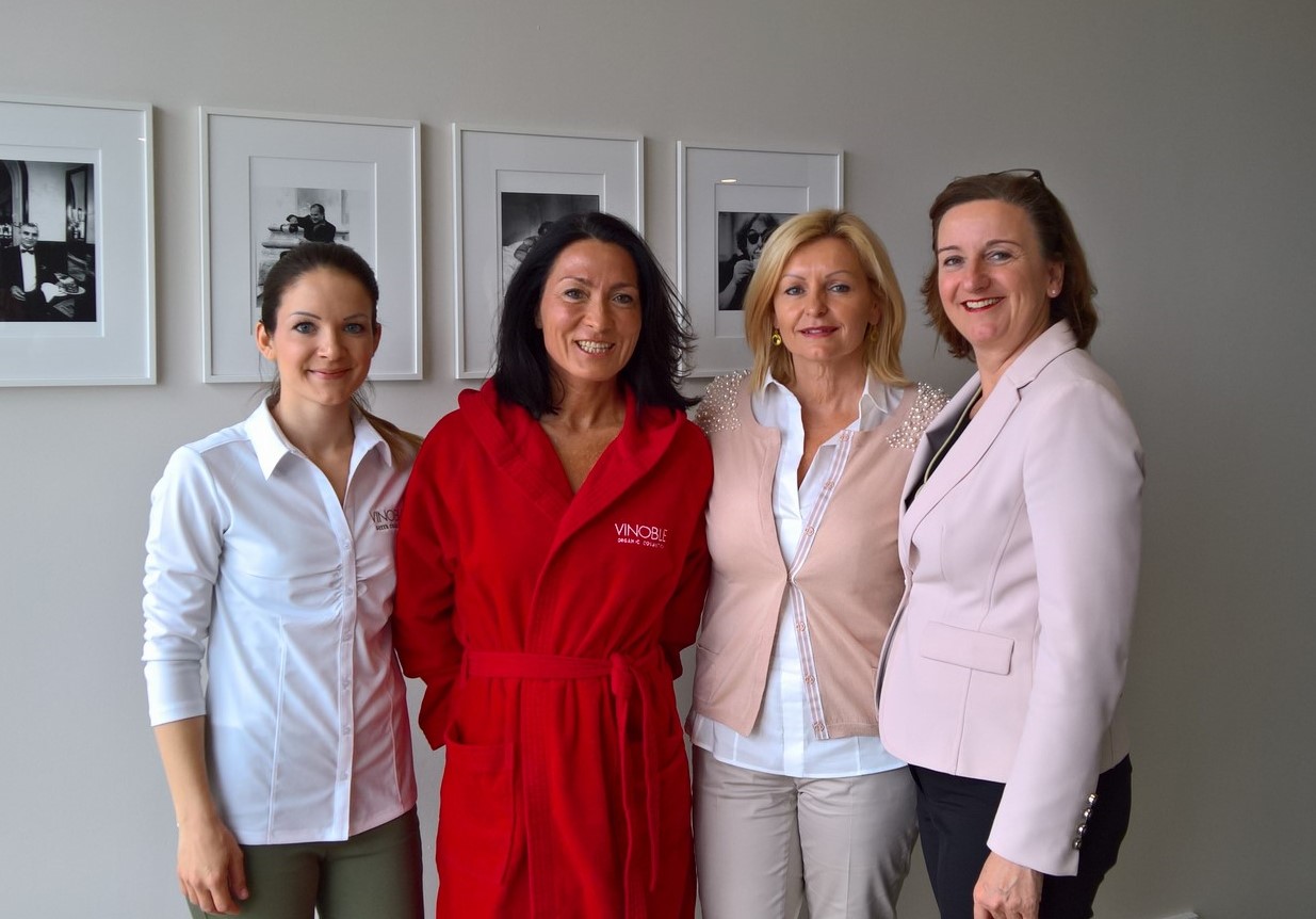 Auf eindrucksvolle Weise zeigten Luise Köfer und ‚ihre‘ Sabrina bei der Präsentation im Wiener Hotel Sans Souci, dass bei der Anwendung von VINOBLE Pro Youth Microneedling und der VINOBLE Pro Youth Lifting-Maske schon in sehr kurzer Zeit ein deutlicher Verjüngungseffekt sichtbar ist.