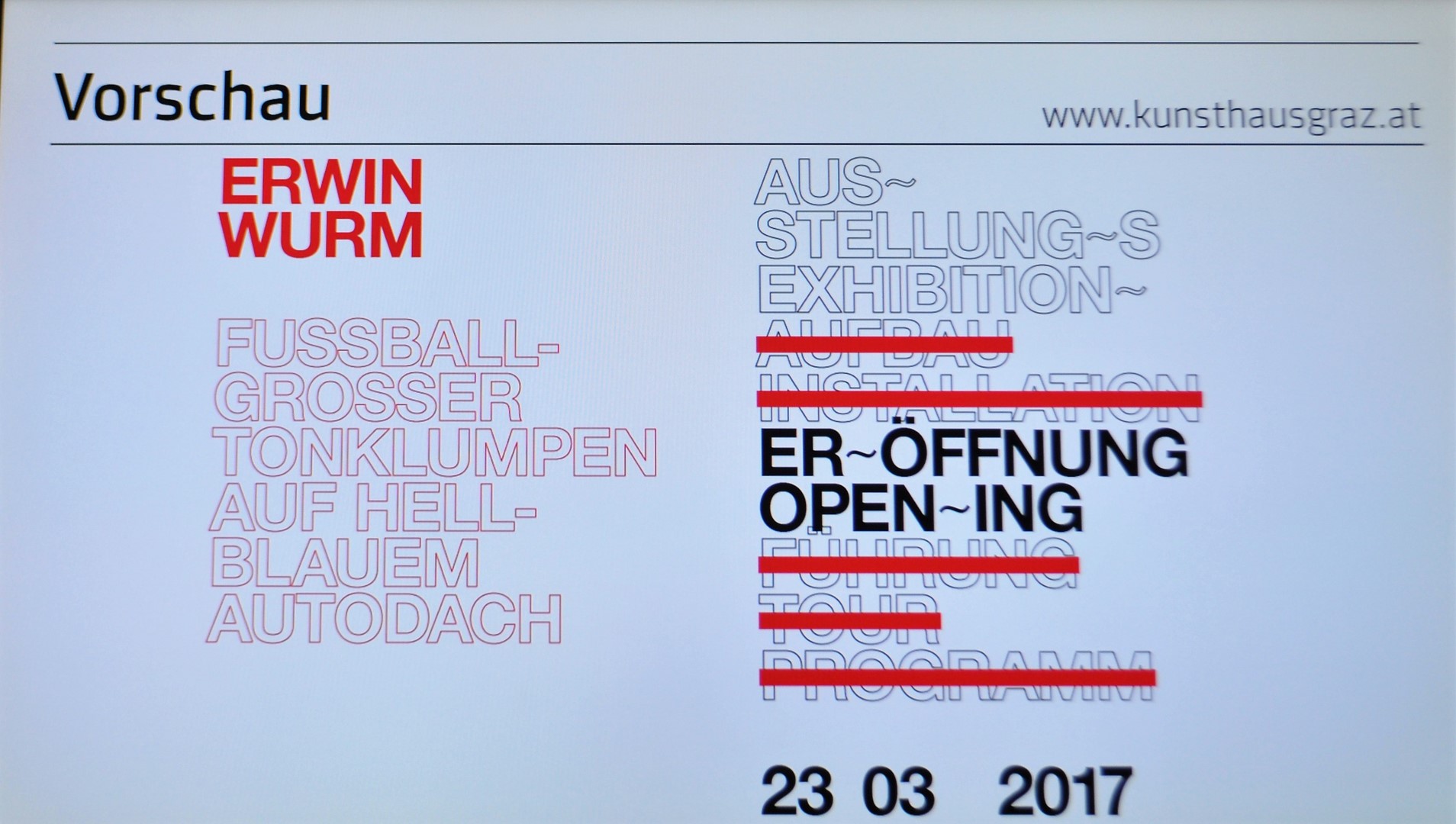 Bis zum 20. August wird die Personale Erwin Wurm Fußballgroßer Tonklumpen auf hellblauem Autodach im Grazer Kunsthaus noch gezeigt. Zu sehen sind von Erwin Wurm speziell für das Kunsthaus Graz entwickelte Arbeiten, die ihren Ausgangspunkt bei der offenen architektonischen Struktur des Kunsthauses nehmen.
