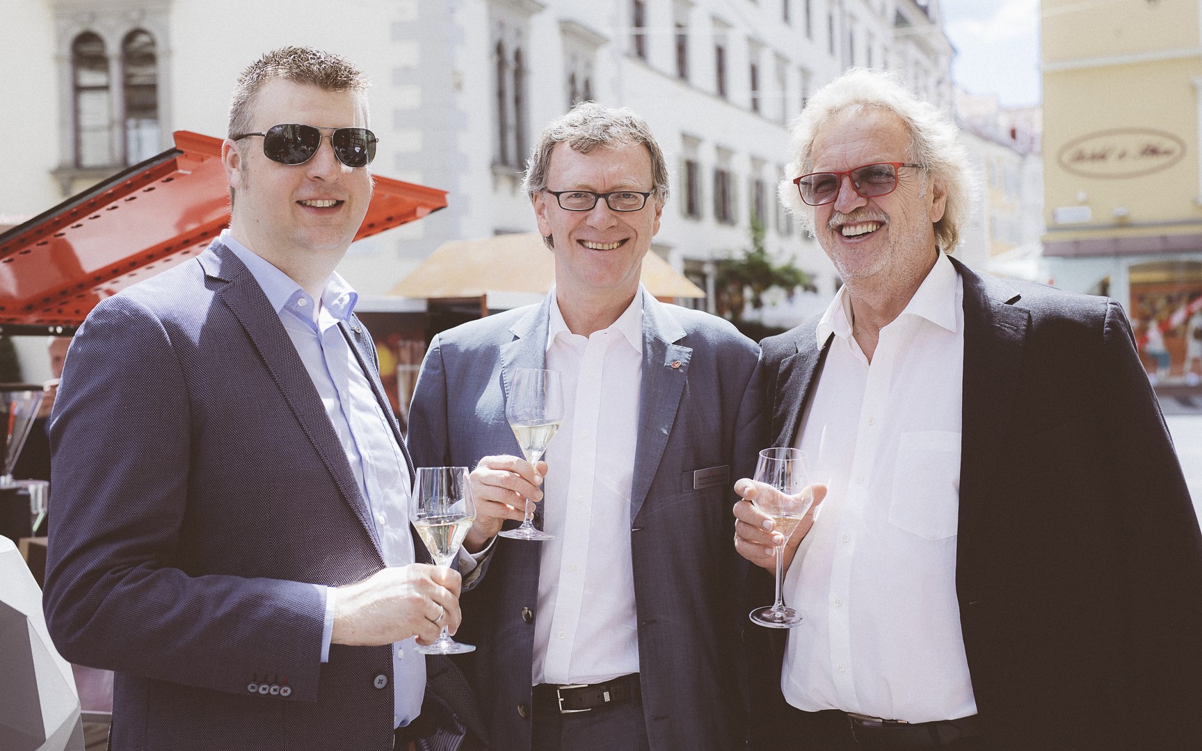 Auf die Eröffnung des Cuisino Gastgartens stieß Casino-Direktor Andreas Sauseng mit Swen und Charly Temmel sowie Genusshauptstadt-Obfrau Waltraud Hutter gerne an (Foto Casinos Austria/Marija Kanizaj)