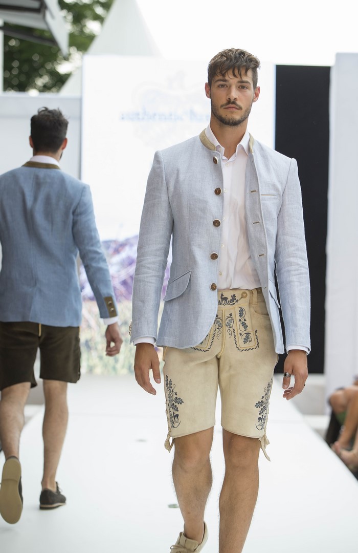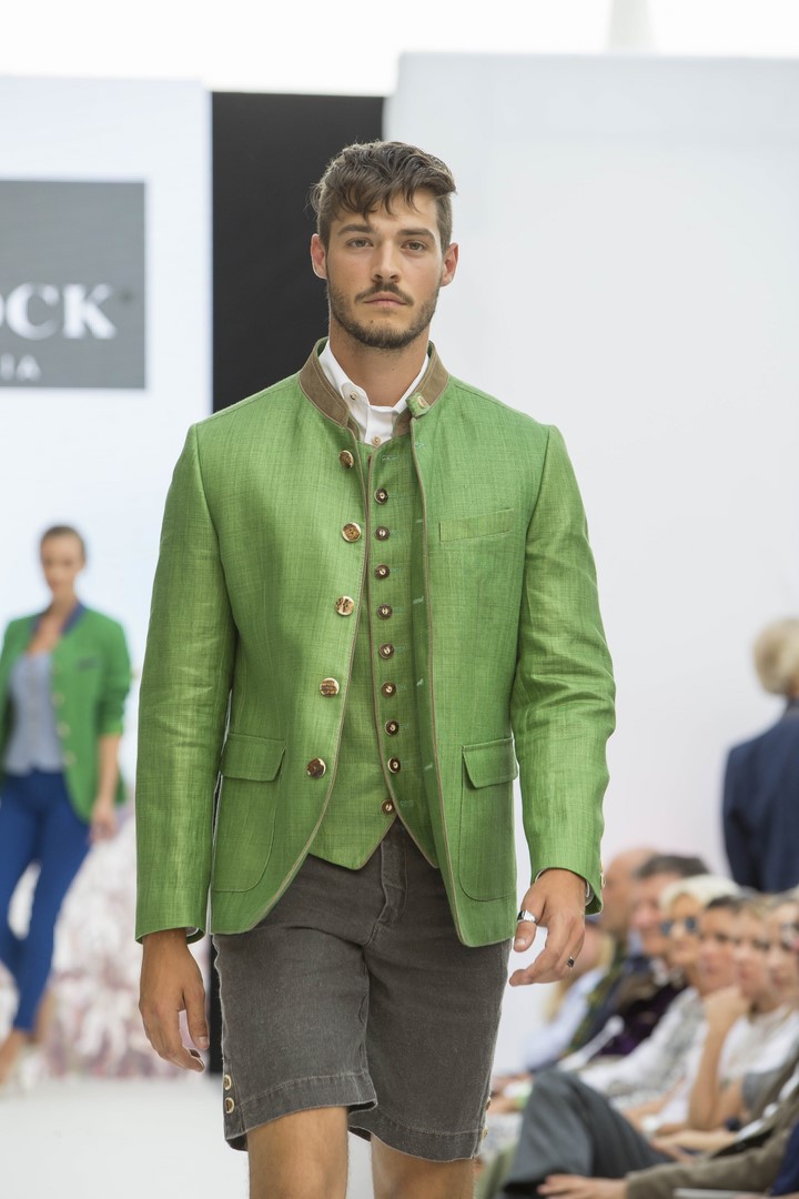 Die dazu passenden Jäckchen sind ungefüttert und farblich genau abgestimmt. Die Herren zeigen Wadeln in den mit Kurbelstickerei verzierten Leinenhosen. Die dazu passenden Janker sind einerseits traditionell in Natur, Grün und Braun aufgemacht, anderseits traut sich der Steinbockmann Farbe zu bekennen und zeigt sich in kräftigem Allurarot, Alpseegrün oder Azuritblau.