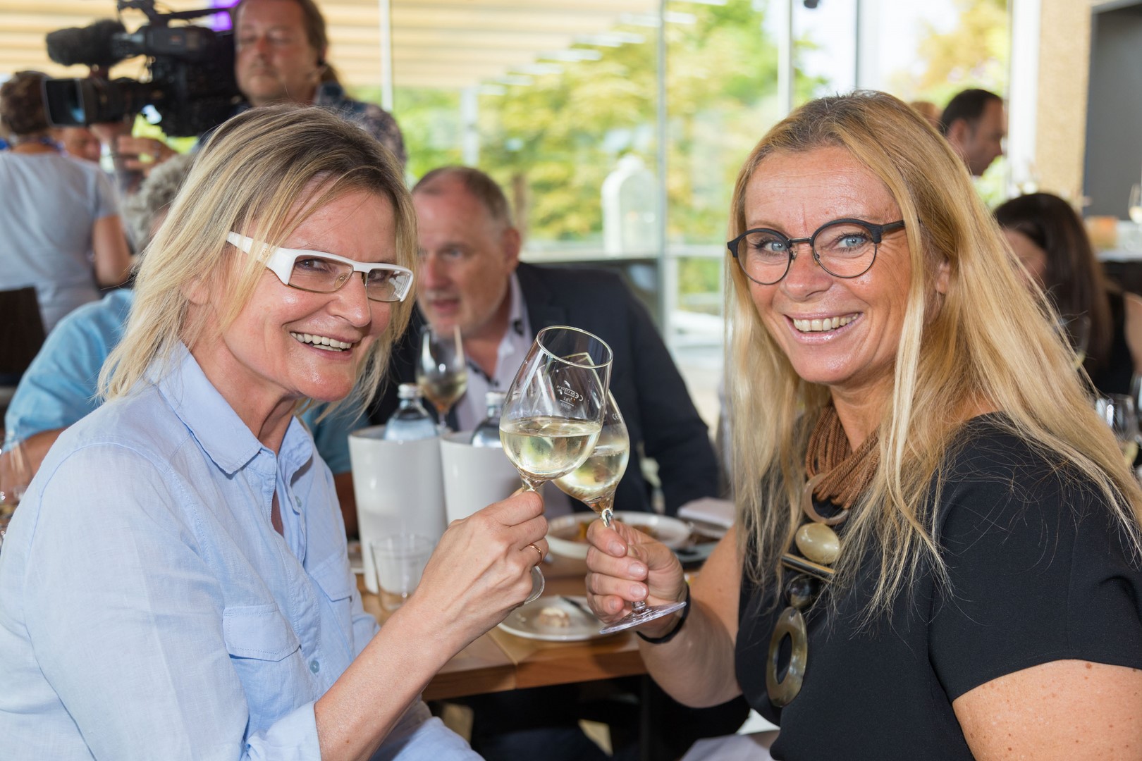 ‚Medien-Ladys Hedi Grager und Nina Müller – Präsentation des Gelben Muskatellers von Peter Kraus (Foto Reinhard Sudy)