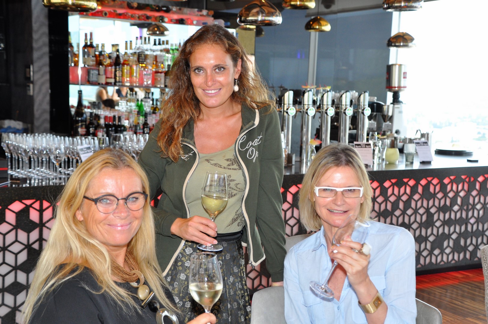 Gastronomin Beatrix Drennig, Marketing-Lady Christina Dow und Journalistin und Bloggerin Hedi Grager genießen den ’neuen‘ Gelben Muskateller von Entertainer Peter Kraus (Foto Reinhard Sudy)