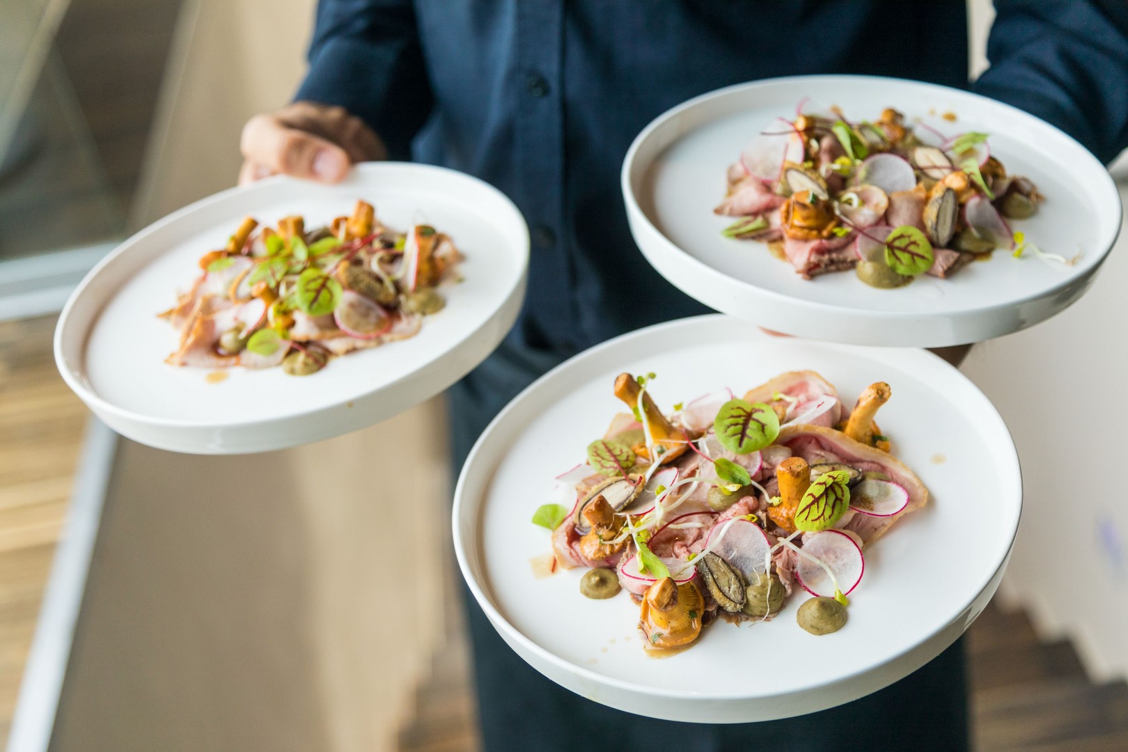 „Summer Special“ des Schlossberg Restaurants: Der Muskateller wird in perfekter Symbiose mit einem steirischen Gericht aus hochwertigen Genussregions-Produkten serviert – einem marinierten Kalbstafelspitz mit Eierschwammerln, zweierlei Käferbohnen, Radieschen und Sprossen (Foto Werner Krug)