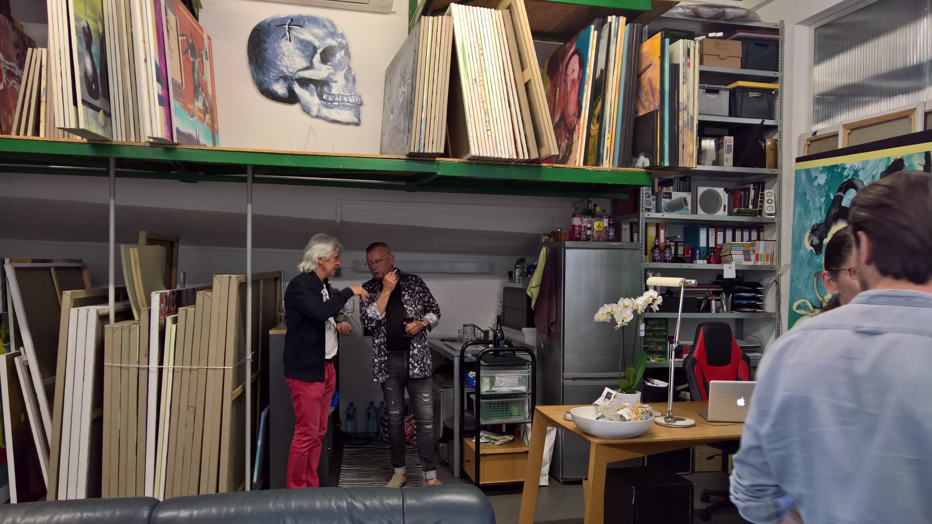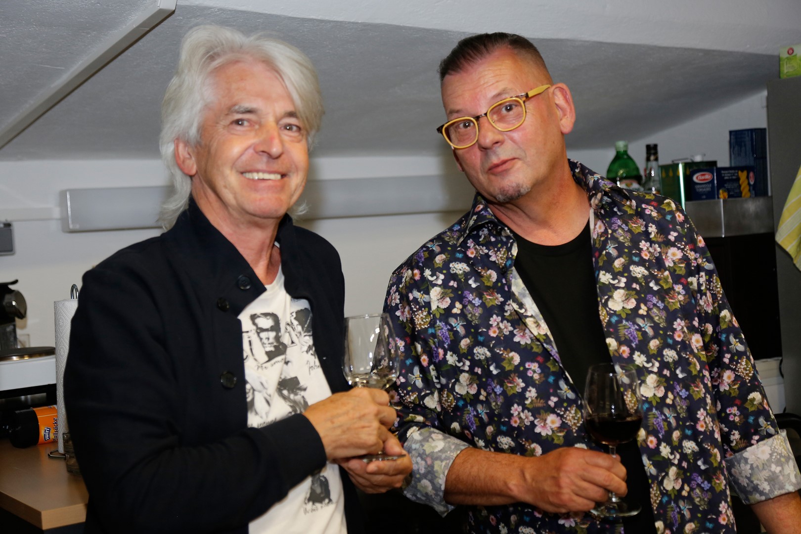 Autor Reinhard Sudy im Gespräch mit dem unglaublich kreativen Künstler und Freund Werner Stadler inmitten seiner wunderbaren Bilder (Foto Hedi Grager)