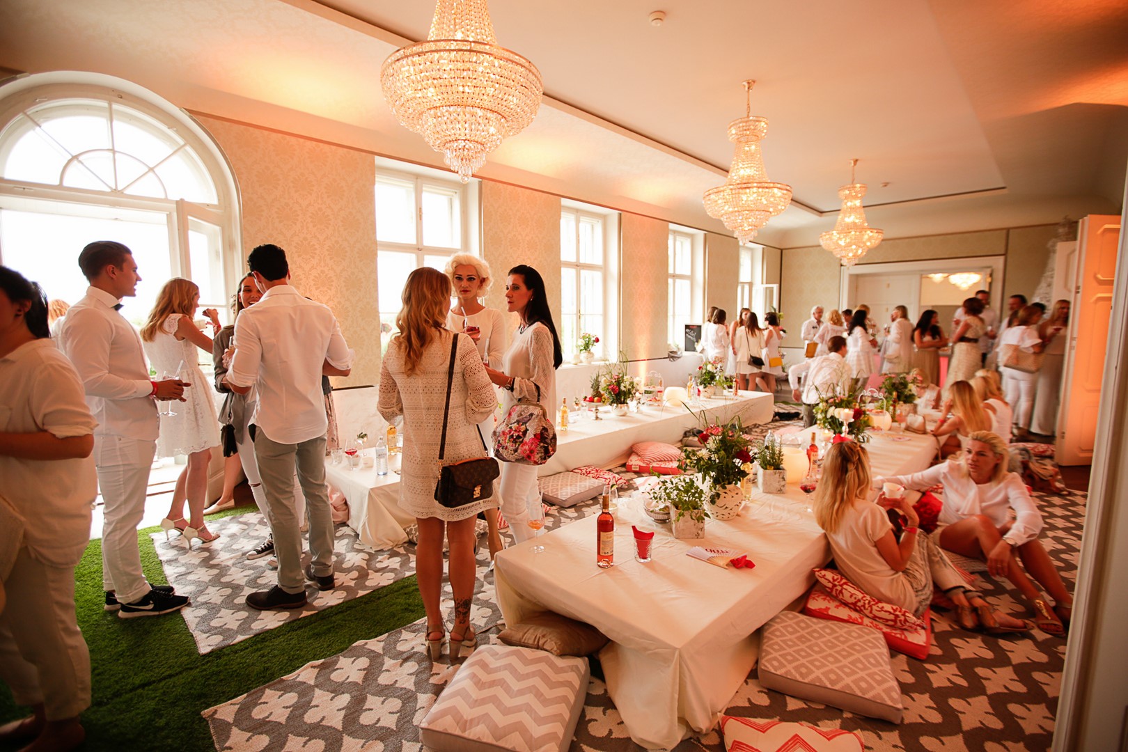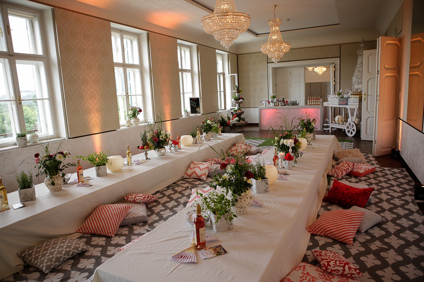 Französische Musik, die von Niki Osl, Gründerin und Designerin von miss lillys hats, ausgewählten Blumen, Blüten und Kräuter für wundervolle Blumengestecke, ein Rasen, Teppiche, viele Pölster und Dekorationen von Lillet verwandelten den Raum in eine gemütliche Lounge.