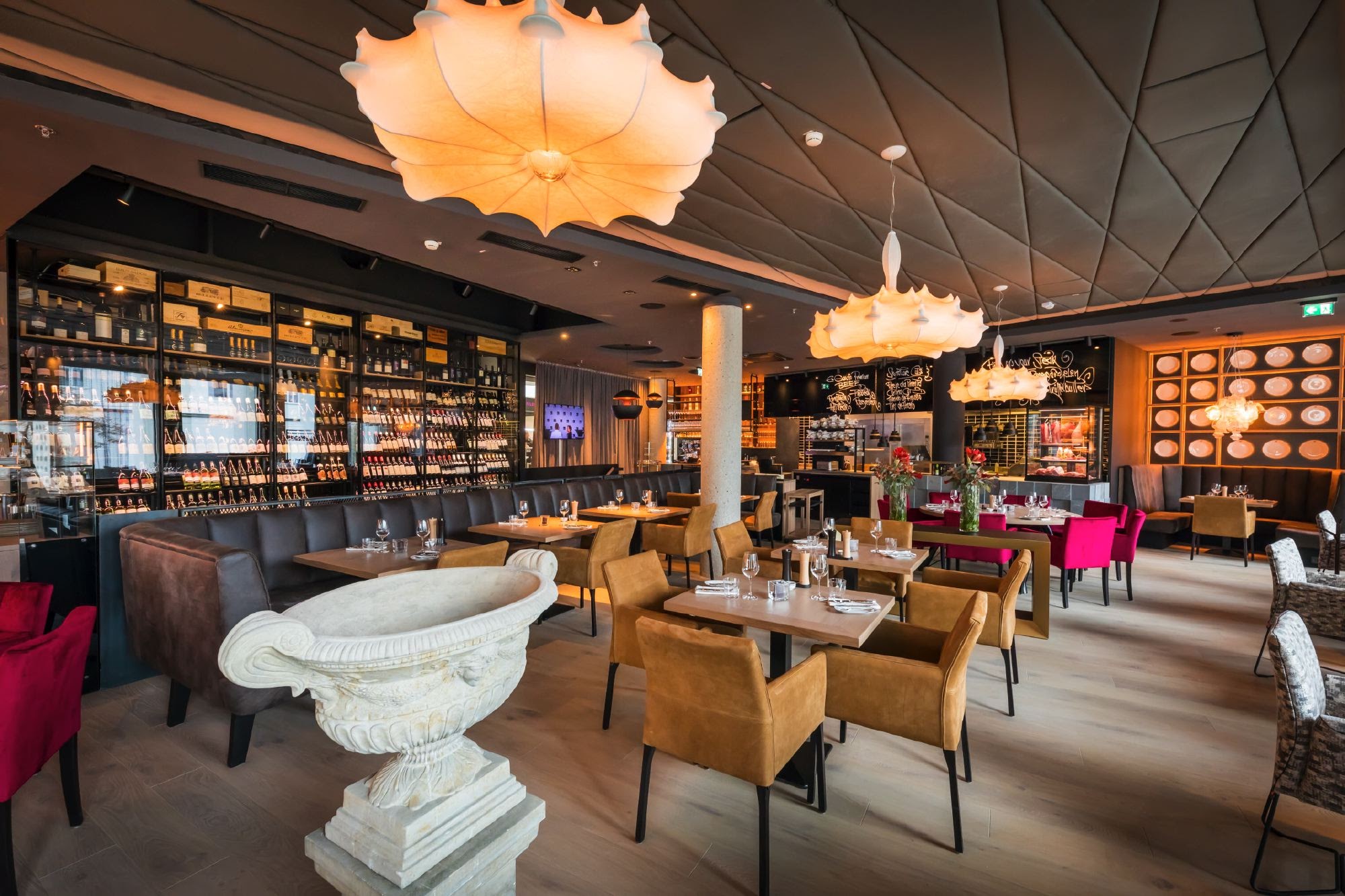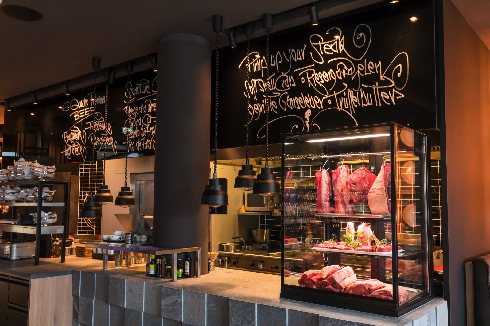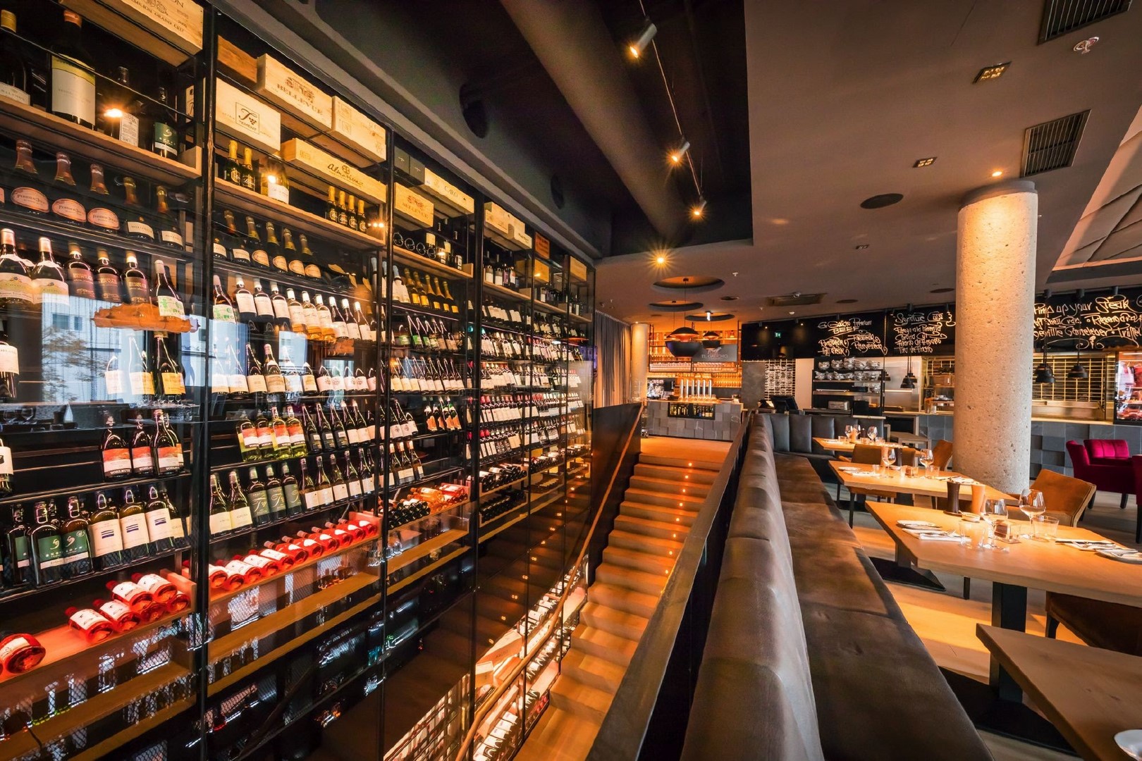 Abends verwöhnt man mit einer breiten Auswahl an Steak-Highlights aus der imposanten, offenen el Gaucho-Grillküche mitten im ersten Stock des Lokals sowie einer feinen, aber bodenständigen Kreativküche. Saisonale Produkte von Lieferanten aus der Region und ein einzigartiges Angebot an Spitzenweinen aus aller Welt machen das Gesamterlebnis perfekt. Für besondere Anlässe steht auch ein eigener „Private Room“ mit exklusivem Buttlerservice zur Verfügung.