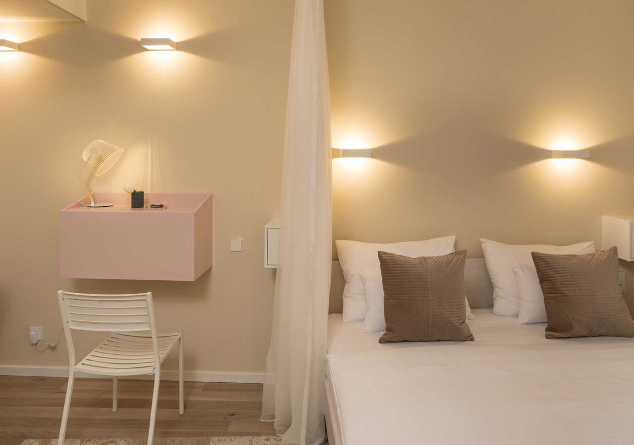Geplant wurde das Hotel von Architekt Michael Kadletz und seiner Gattin Mag. Evelyn Kadletz. Ihr täglicher Weg ins Büro führte sie immer an diesem Objekt vorbei. „Eines Tages war es dann soweit, dass wir hier unsere doch schon lang gehegte Idee eines Hotels umsetzen konnten,“ wie Evelyn mit einem Lächeln verrät. Liebevoll wurde das Hotel dann von ihr eingerichtet. Jedes Zimmer ist hell, freundlich – und anders. So ist im gesamten Hotel ihre Liebe zu kreativem Design und zu einzelnen Details zu spüren.