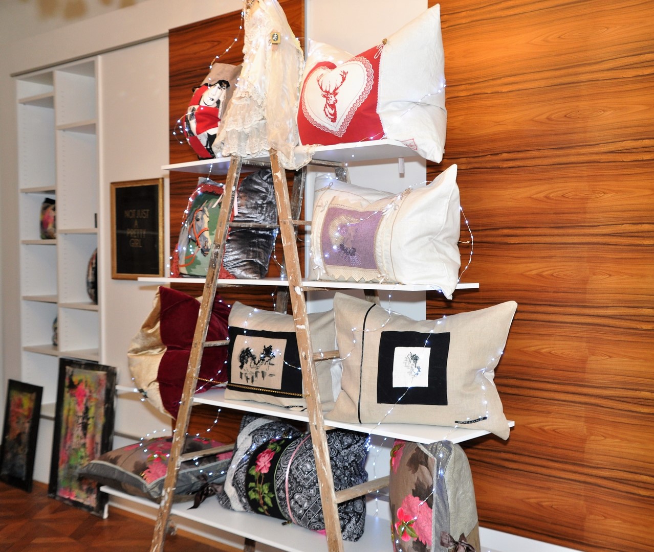 Sehr gefragt sind auch die außergewöhnlichen Zier-Pölster, die Kim näht. „Ich habe Mode studiert und eine Zeitlang bei Agent Provocateur gearbeitet, habe Korsetts genäht und Künstler wie Seal oder Gwen Stefani angezogen. Irgendwann merkte ich meine Liebe zu Interior Design.“ Anfangs verschenkte sie ihre Pölster an Freunde, aber es kamen dann immer mehr Anfragen. Auf der ganzen Welt sammelt sie dafür Vintage Stoffe und kombiniert sie mit modernen Elementen wie Neonbändern. Mit ihren Pölstern und auch Kronleuchtern mit alten Puppen, die natürlich Unikate sind, verleiht sie Räumlichkeiten etwas Märchenhaftes.