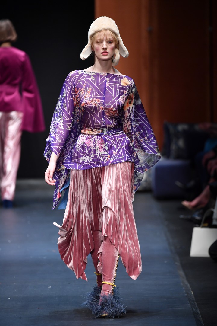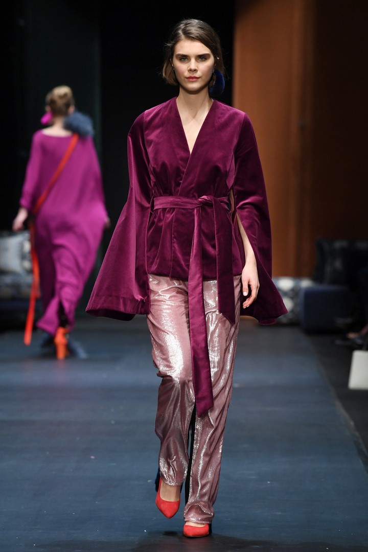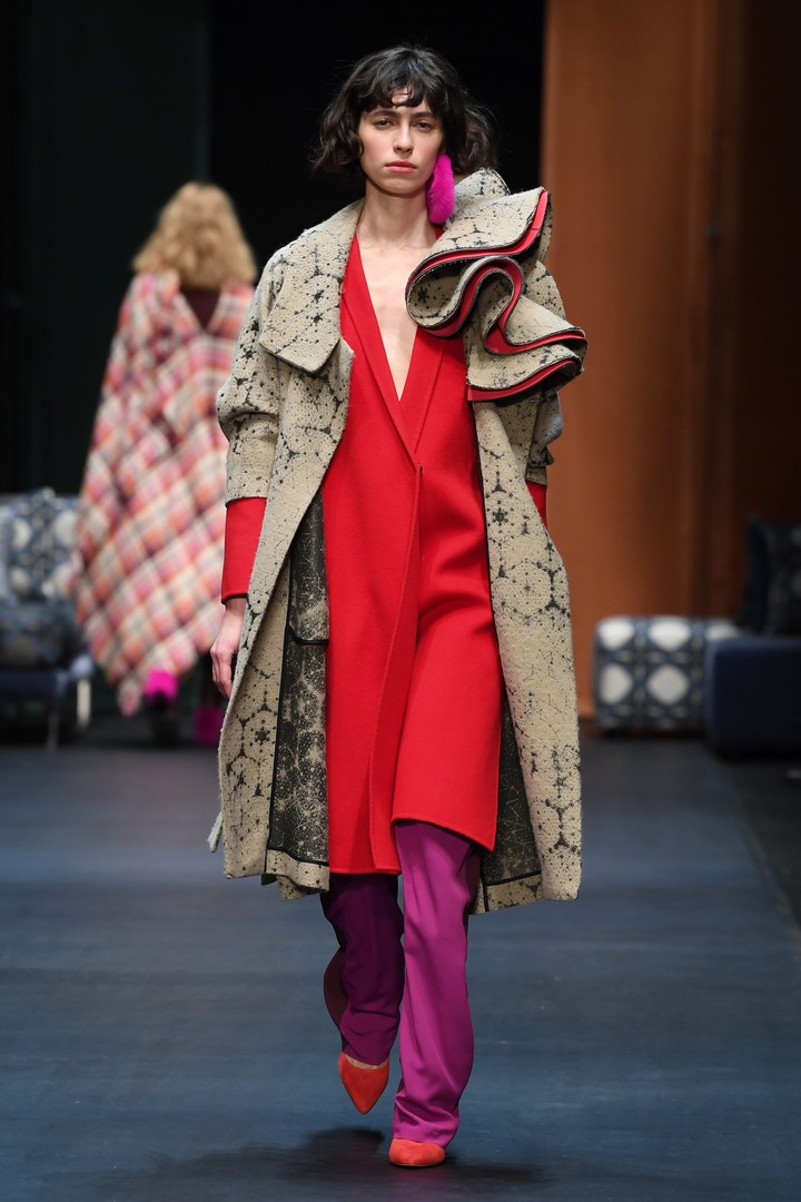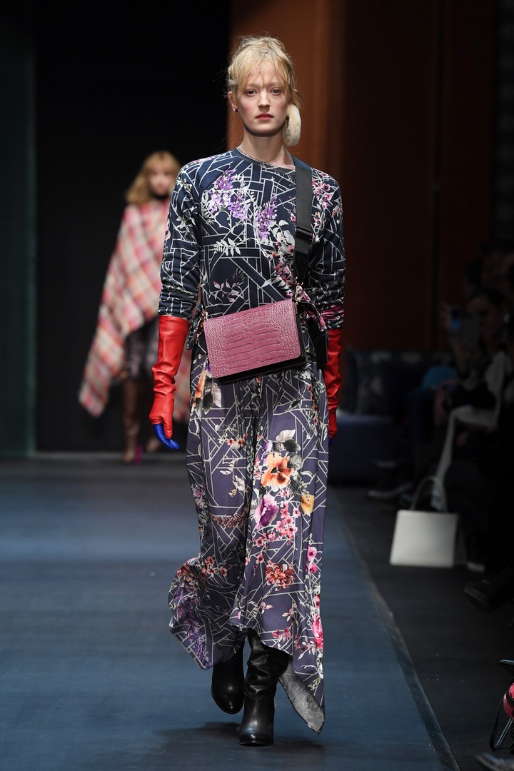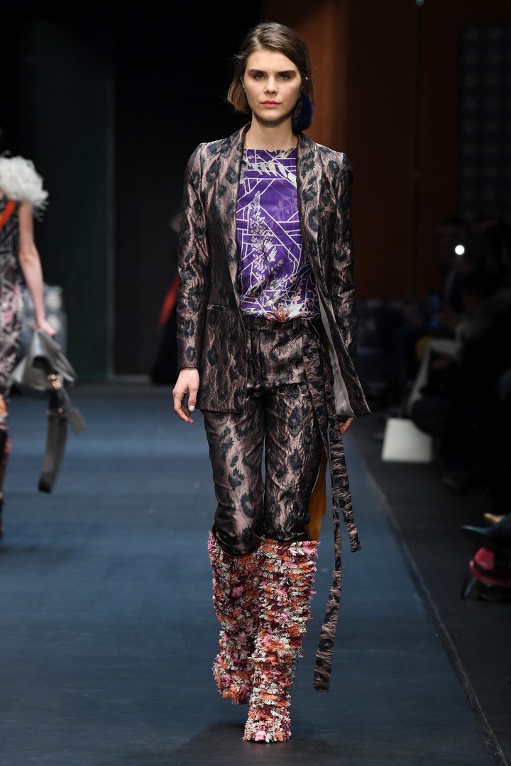 Schon in seiner Sommerkollektion hatte DAWID TOMASZEWSKI das Thema Japan, jetzt geht es in Europa damit weiter. Inspiriert von dem Europa der 60er Jahre, greift der Designer Schnitte und Materialien auf und verbindet diese mit typischen Motiven aus japanischen Gärten. Er kreiert eine Verbindung mit den ikonischen Bauhausprints aus früheren Kollektionen. Die Koi-Motive aus der SS18 Kollektion werden ergänzt durch Kraniche. Hinzu kommen animalische Prints, wie Leopard, Schlange und Krokodil. Gepaart werden diese mit Beerentönen und knalligen Farben, wie pink, orange und azurblau.