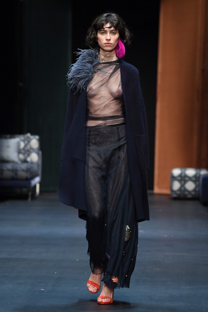BERLIN, GERMANY – JANUARY 15: (EDITORS NOTE: Image contains nudity.) A model walks the runway at the Dawid Tomaszewski show during the MBFW Berlin January 2018 at ewerk on January 15, 2018 in Berlin, Germany. (Photo by John Phillips/Getty Images for MBFW)