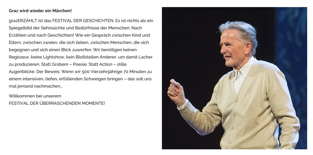 Was 1988 mit der ersten „Langen Nacht der Märchenerzähler“ begann, entwickelte sich im Laufe von 30 Jahren zu einem der weltweit bedeutendsten, Europas größtem und Österreichs einzigem „Festival der erzählenden Künste“. Im Mittelpunkt stehen seit jeher Toleranz, spielerische Kulturvermittlung und Grenzüberschreitung. Seit über 30 Jahren wird die älteste Form menschlichen Ausdrucks, das Erzählen einer Geschichte, präsentiert. Das Festival steht für Entschleunigung und für das Ursprüngliche. Es präsentiert die einfachste und zugleich wunderbarste Form der Kommunikation.