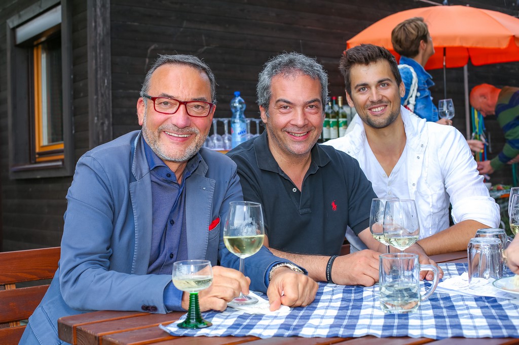 Großes Beitragsfoto: Schauspieler Gerald Pichowetz, Winzer Michael Höfler und Schauspieler und Kabarettist Christoph Fälbl (Foto Moni Fellner)