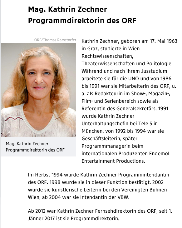 Die Steirerin Kathrin Zechner begann ihre großartige Karriere als Mitarbeitern des ORF. Nach einigen erfolgreichen Zwischenstationen in der Unterhaltungsbranche kam sie 1994 als Programmintendantin wieder zurück zum ORF, wechselte 2002 zu den Vereinigten Bühnen Wien und ist seit 2012 wieder beim ORF: erst als Fernseh-, dann als Programmdirektorin. Für die Reihe „Universum History – Unser Österreich“ erhielt sie heuer übrigens die goldene Romy.