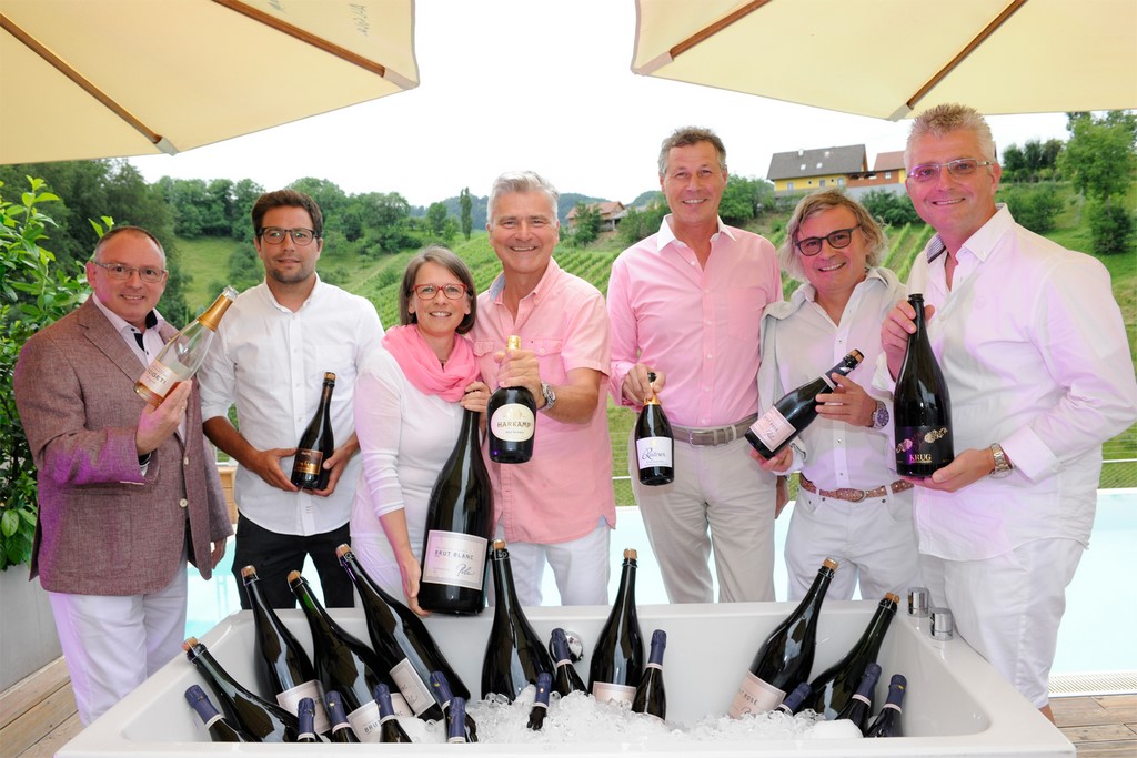 Großes Beitragsfoto: pink&white Event am Gut Pössnitzberg mit erfolgreichen Sektwinzern: Peter Szigeti, Tim Lo Duca, Petra Harkamp, Erich Polz, Christian Reiterer, Walter Polz und Gustav Krug (Foto Gut Pössnitzberg)